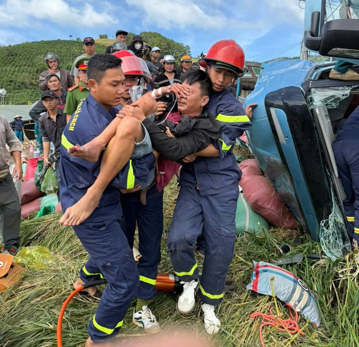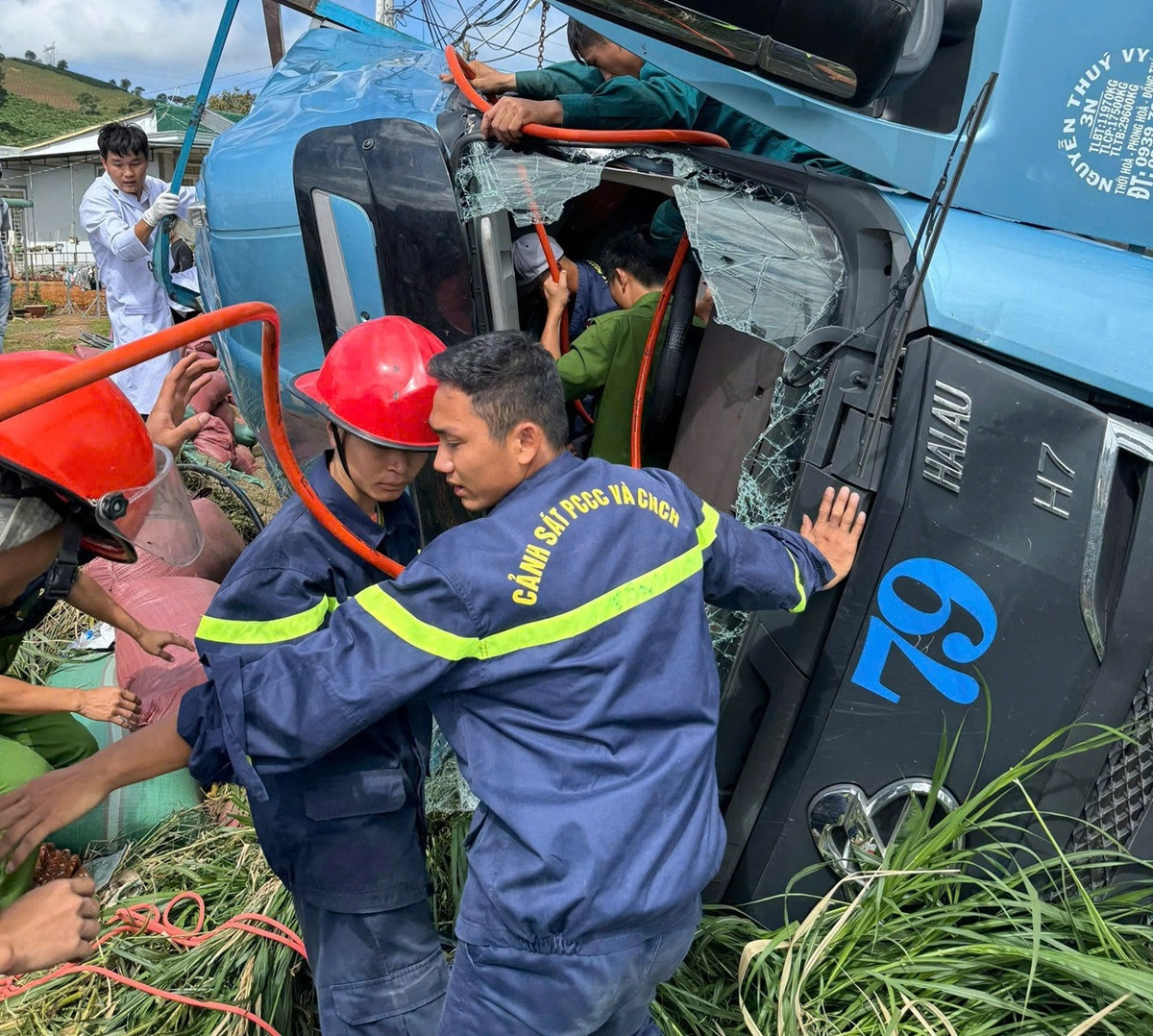 Khoảng 9h30 cùng ngày, xe tải mang biển kiểm soát 66G-006.xx chở hàng chục tấn cà phê khi lưu thông đến khu vực đầu đèo Phú Sơn (xã Phú Sơn Lâm Hà, tỉnh Lâm Đồng) thì không may gặp sự cố bị lật. Tài xế và phụ xe (cùng 40 tuổi, trú tỉnh Vĩnh Long) bị mắc kẹt bên trong cabin.