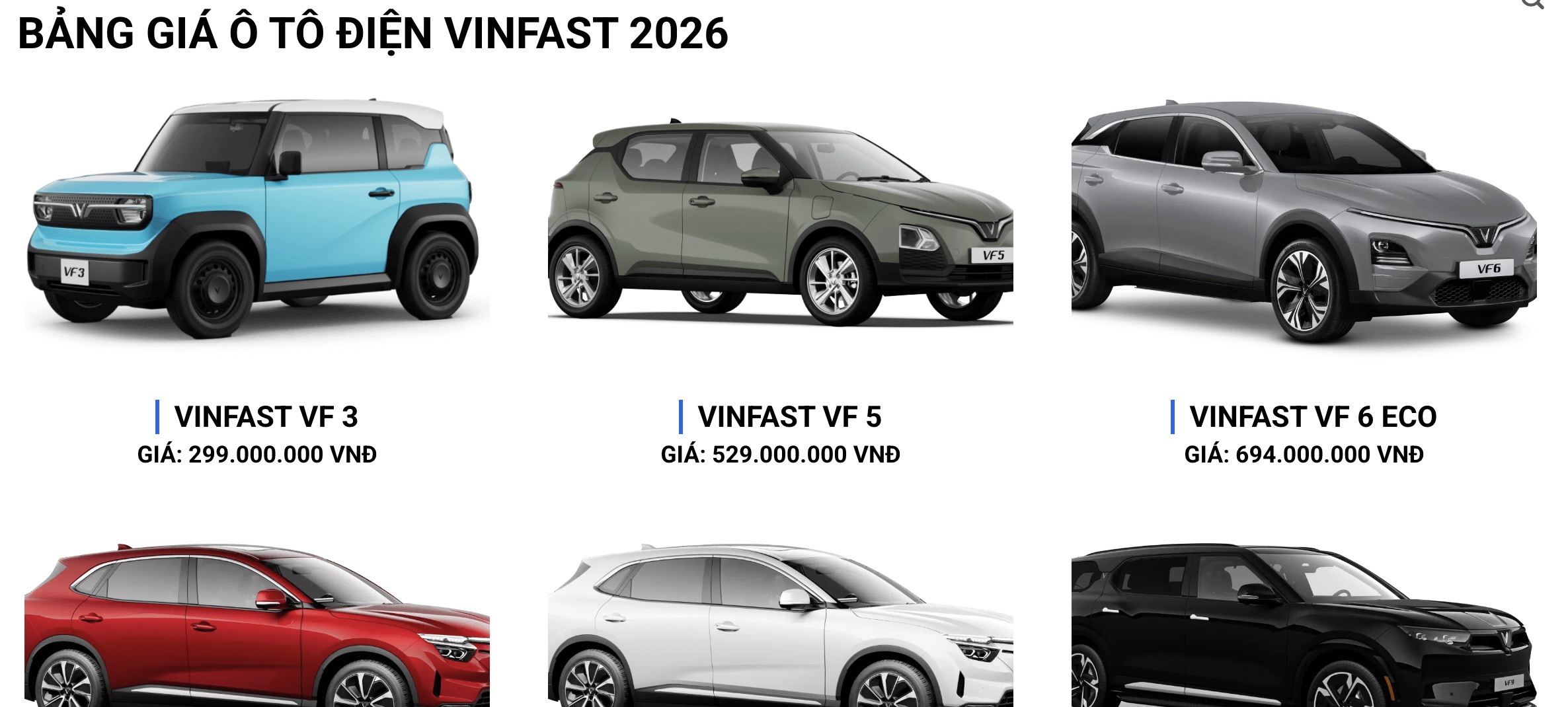 Theo bảng giá cập nhật năm 2026, mẫu VF 3 có giá khoảng 299 triệu đồng, VF 5 khoảng 529 triệu đồng, VF 6 từ 694 triệu đồng và VF 8 từ 1,019 tỉ đồng. Các dòng cao cấp hơn như VF 9 có giá từ 1,499 tỉ đồng.