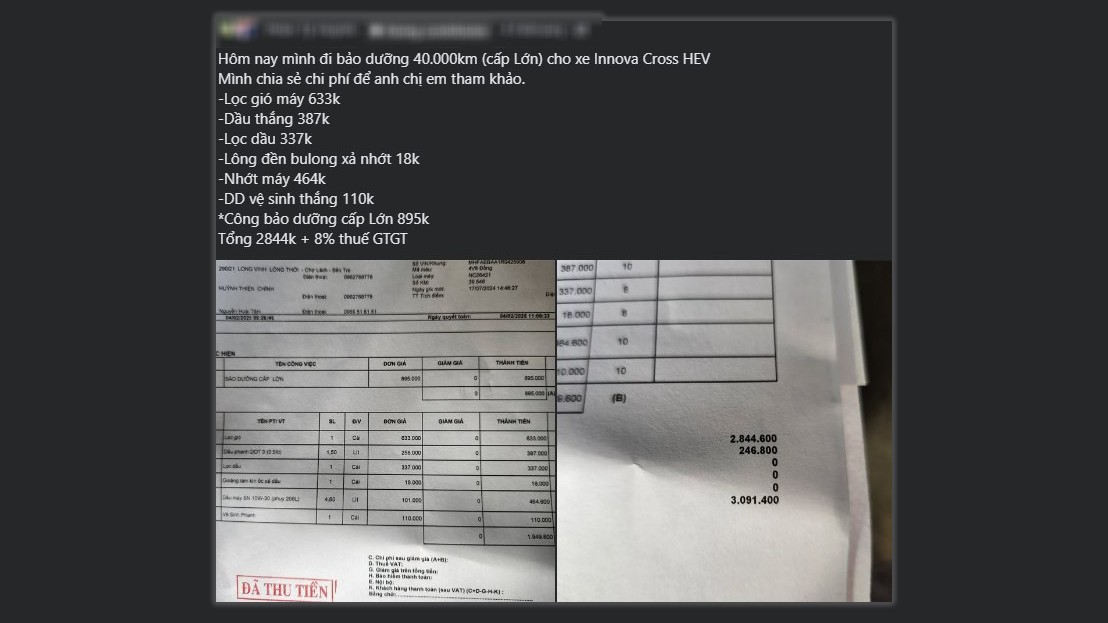 Một chủ xe Toyota Innova Cross HEV cho biết chi phí bảo dưỡng tại mốc 40.000 km chỉ hơn 3 triệu đồng, đã bao gồm thuế giá trị gia tăng. Đây được xem là mốc bảo dưỡng cấp lớn theo khuyến nghị của nhà sản xuất.
