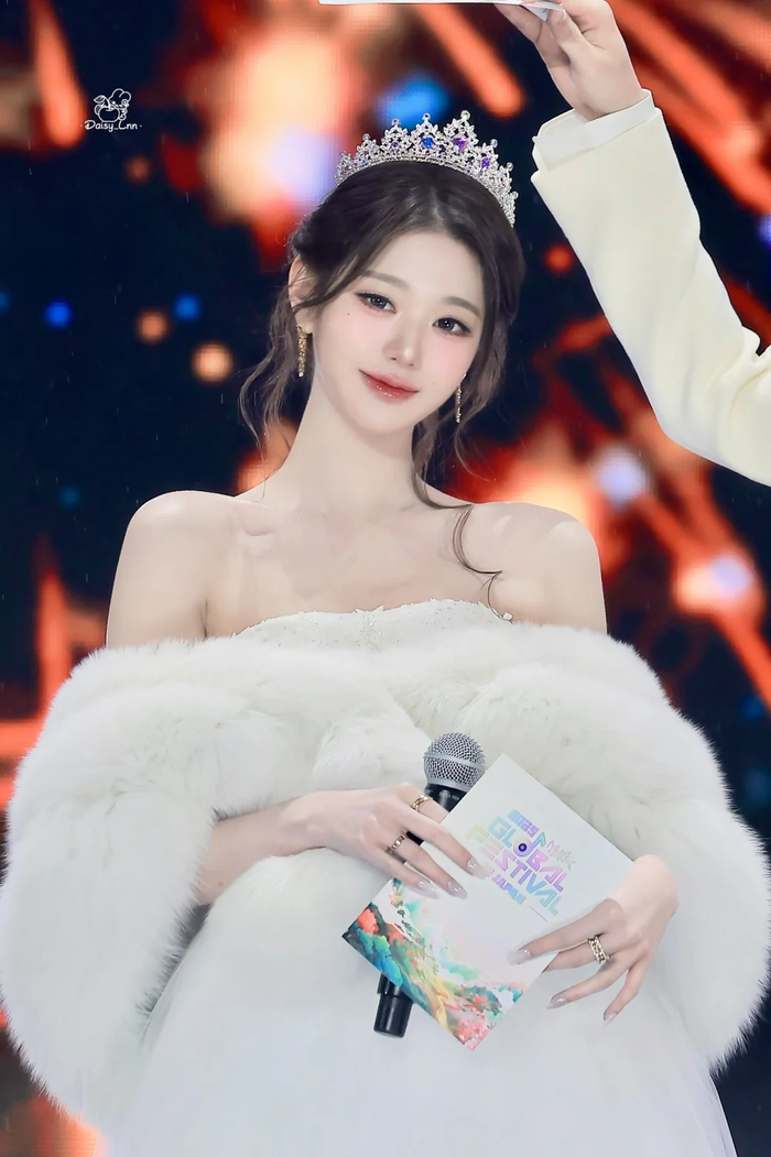 Theo kế hoạch, Wonyoung đảm nhận vị trí MC cho Music Bank Global Festival diễn ra trong hai ngày 13 và 14/12, đồng hành cùng nam diễn viên, ca sĩ Lee Junyoung. Ngay trong phần mở màn của đêm diễn đầu tiên, sự xuất hiện của thành viên IVE đã khiến khán giả không khỏi trầm trồ. Lựa chọn chiếc váy dạ hội trắng mang thiết kế tinh tế, kết hợp cùng vương miện và lối trang điểm trong trẻo, Wonyoung ghi điểm tuyệt đối với vẻ đẹp được ví như “công chúa bước ra từ truyện cổ tích”.