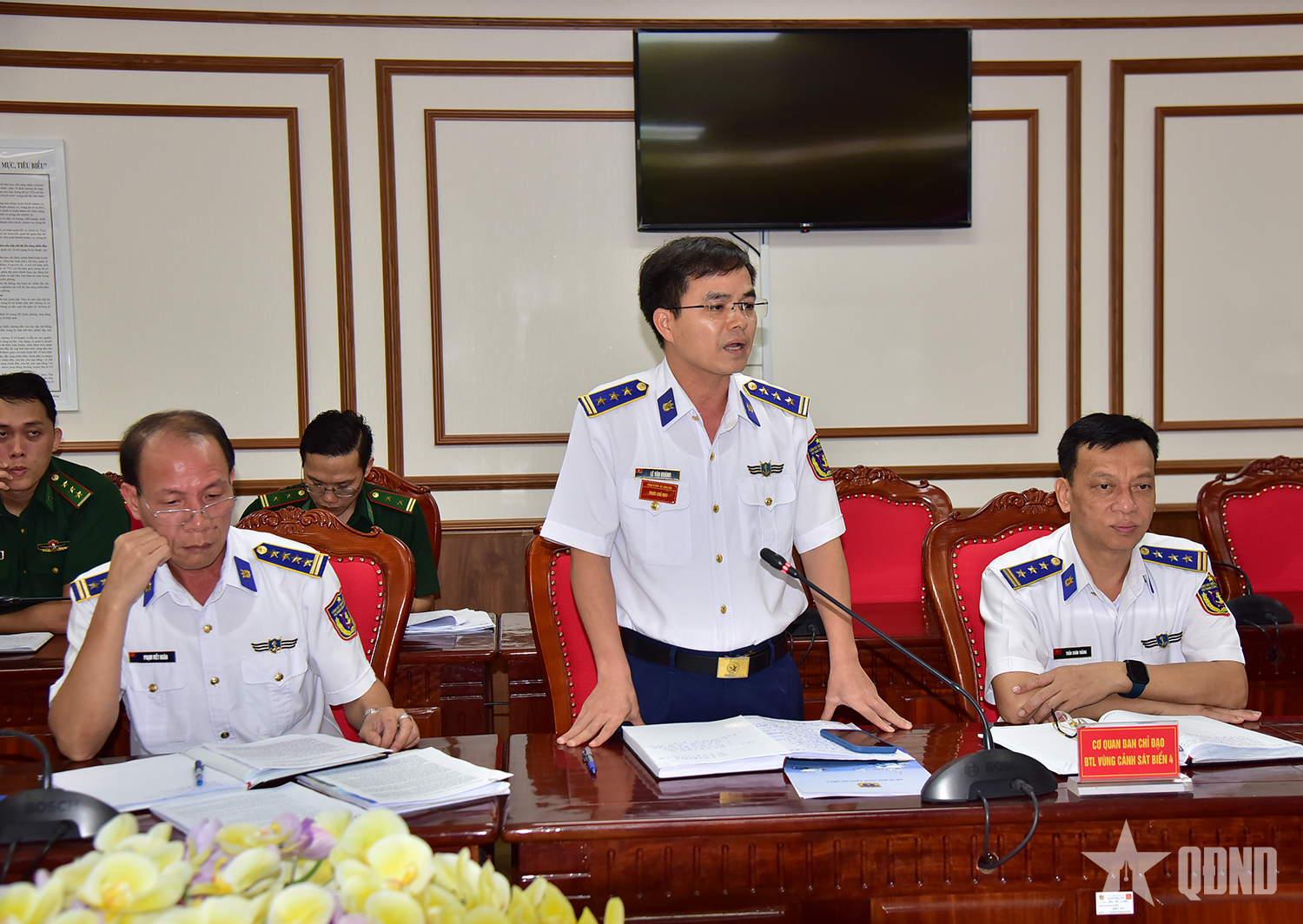 Thượng tá Lê Văn Khánh, Trưởng phòng Chống tội phạm, vi phạm, Bộ tư lệnh Vùng Cảnh sát biển 4 phát biểu tại buổi làm việc.