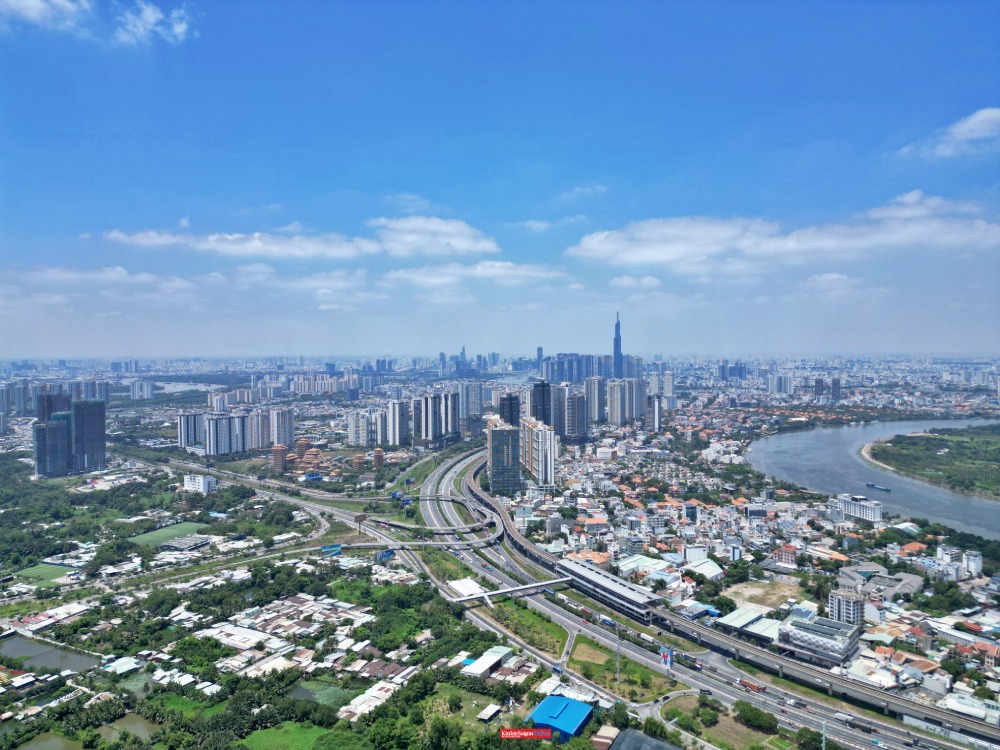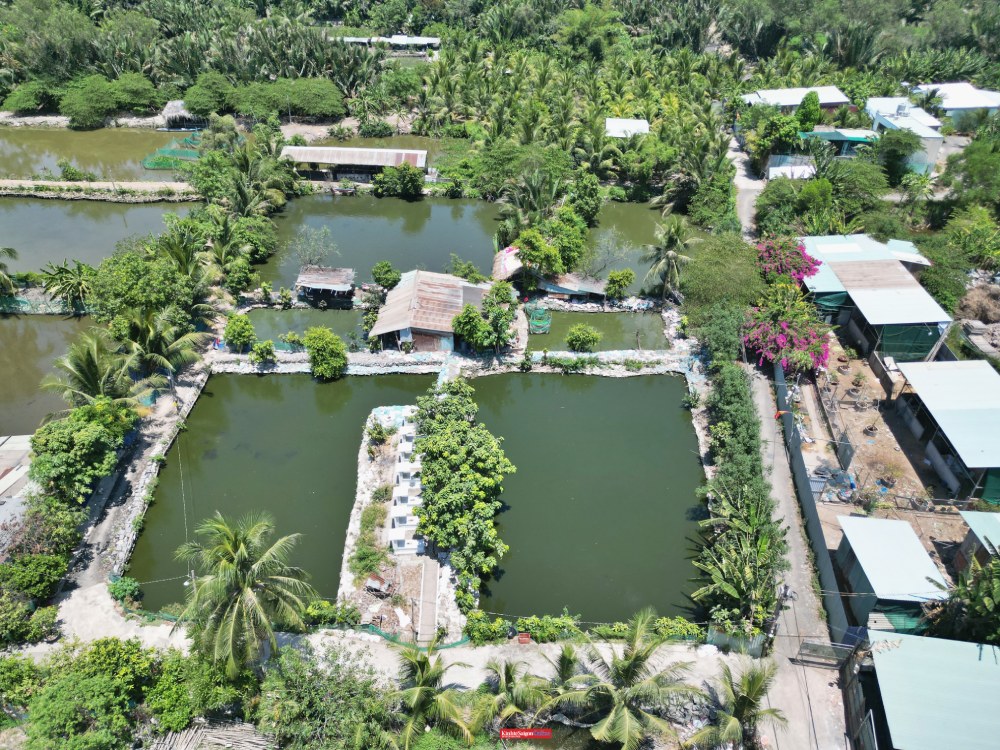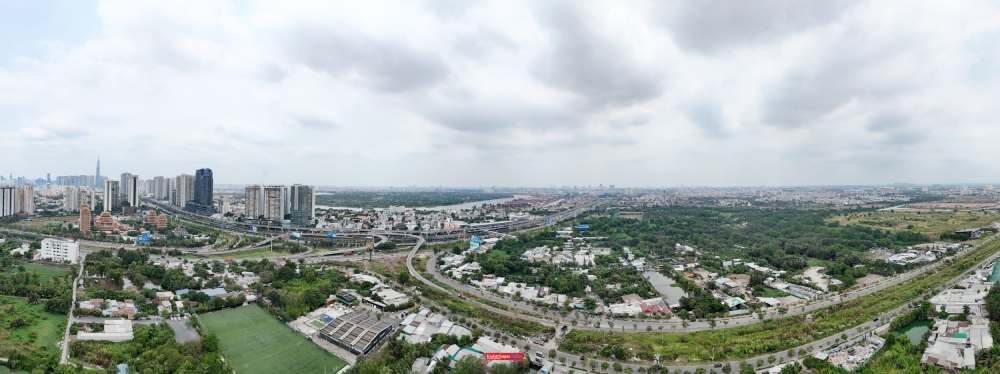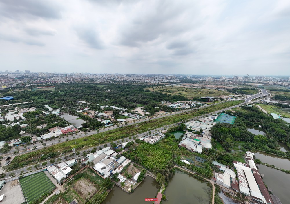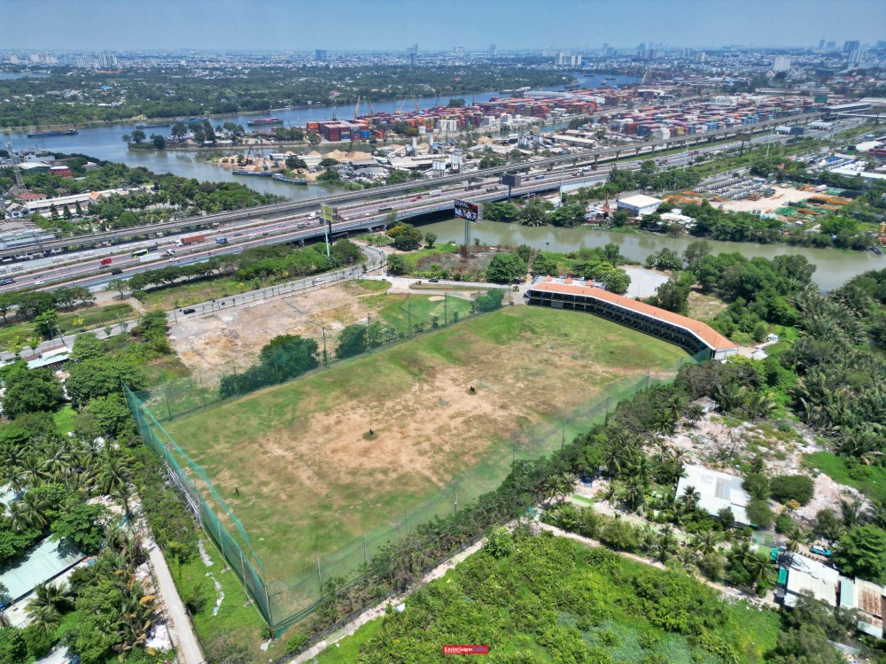 Từ trên cao, toàn bộ khu quy hoạch Khu liên hợp thể dục thể thao quốc gia Rạch Chiếc chủ yếu vẫn là đất trống, ao hồ và kênh rạch.