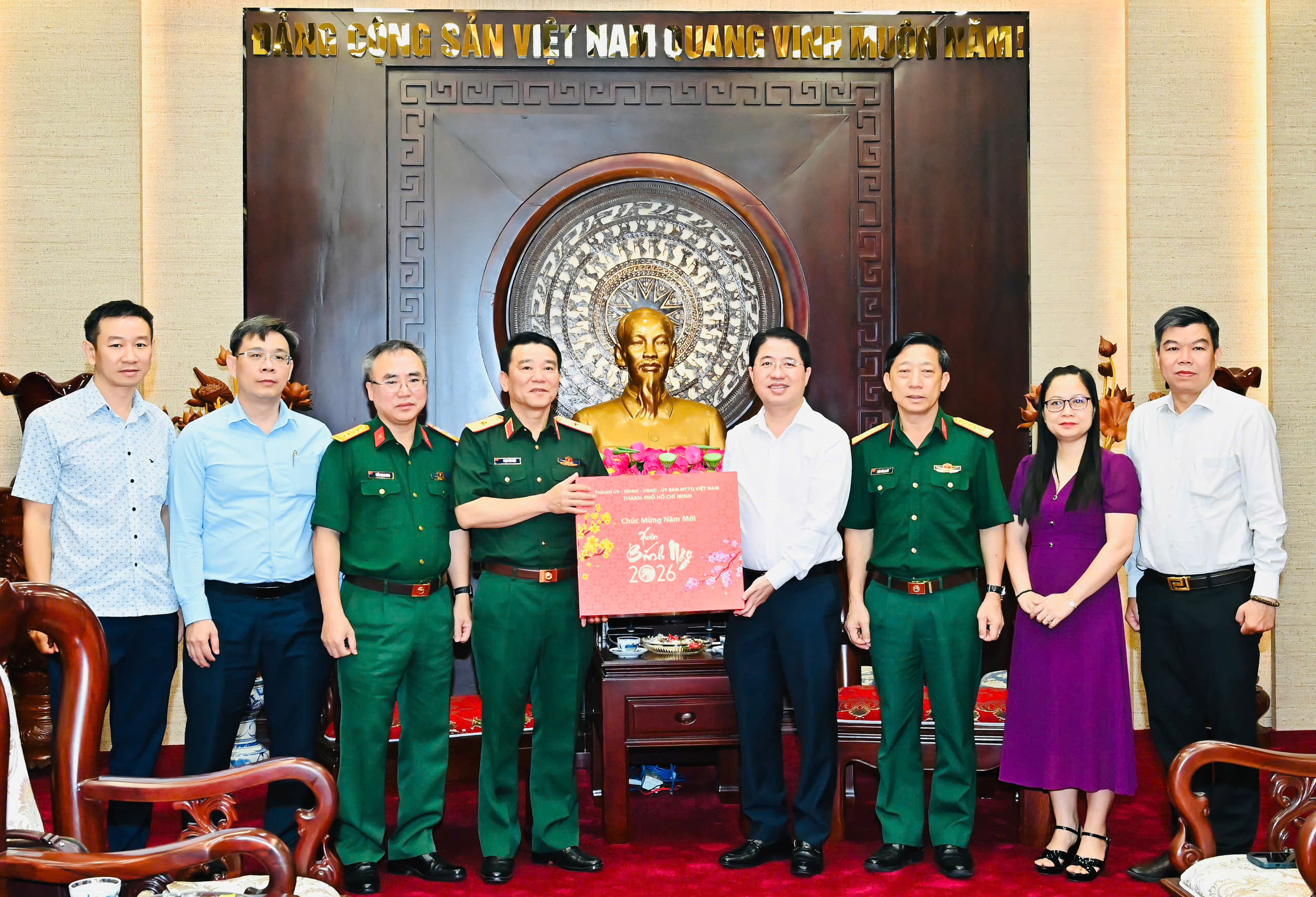 Thay mặt lãnh đạo TPHCM, đồng chí Phạm Hồng Sơn trân trọng cảm ơn đoàn công tác đã đến thăm, chúc tết, và gửi lời chúc mừng năm mới tới cán bộ, chiến sĩ Bộ Tư lệnh Lăng Chủ tịch Hồ Chí Minh.