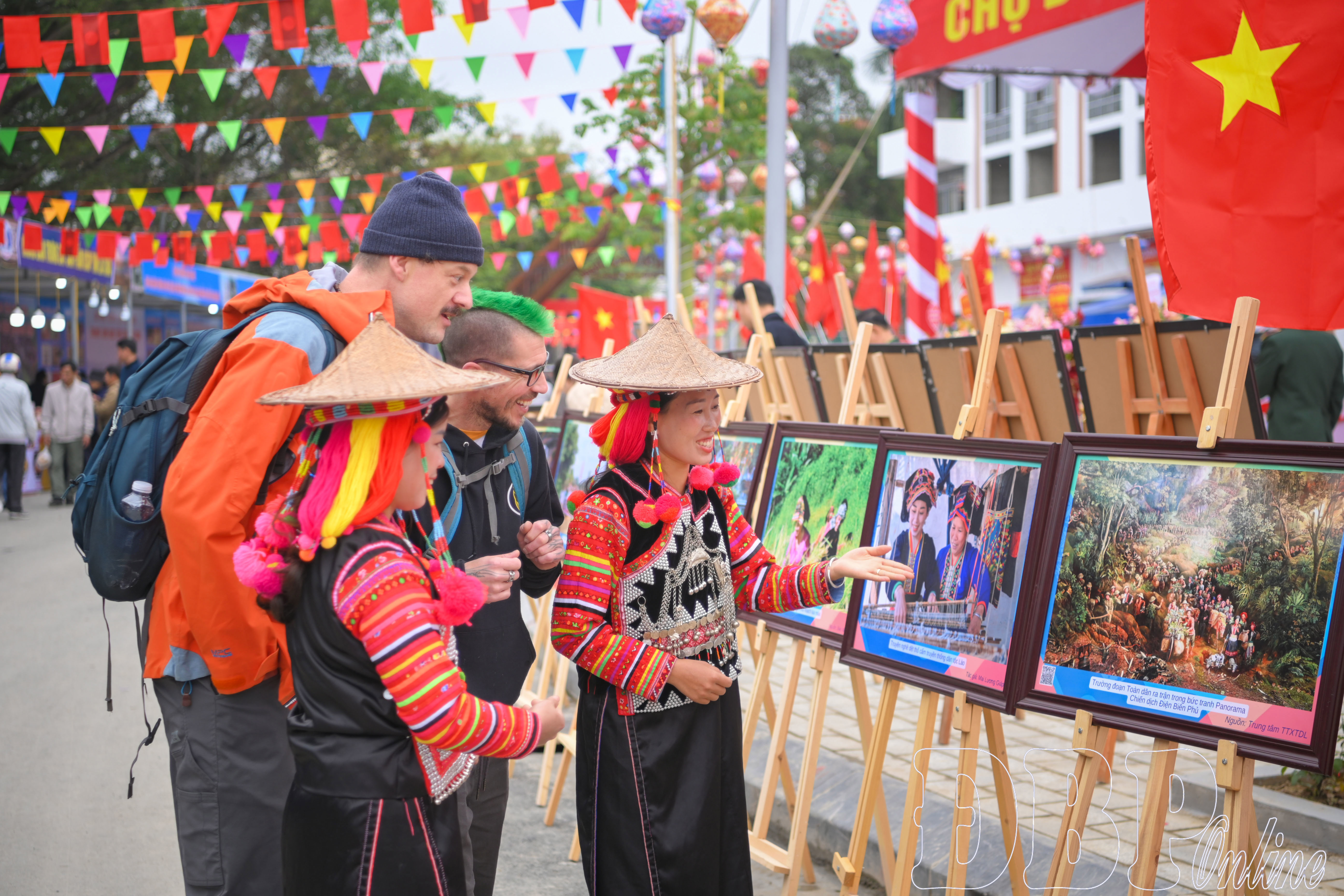Du khách quốc tế tham quan, trải nghiệm hoạt động tại không gian trưng bày giới thiệu, quảng bá sản phẩm văn hóa và du lịch trong khuôn khổ Lễ hội Ném còn ba nước Việt Nam - Lào - Trung Quốc lần thứ IX, năm 2025
