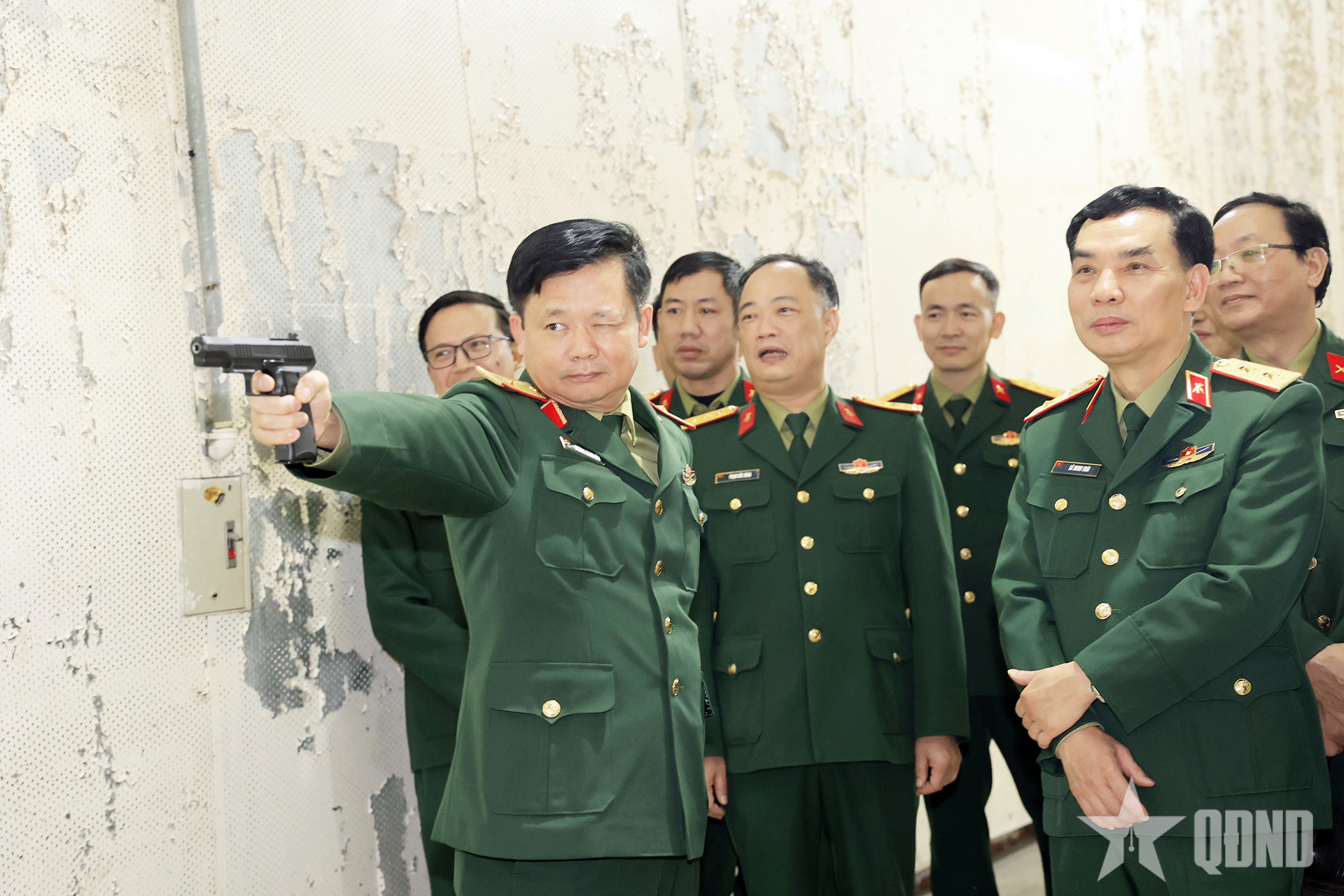 Thiếu tướng, TS Dương Minh Hải tham quan sản phẩm nghiên cứu tại Học viện Kỹ thuật Quân sự.