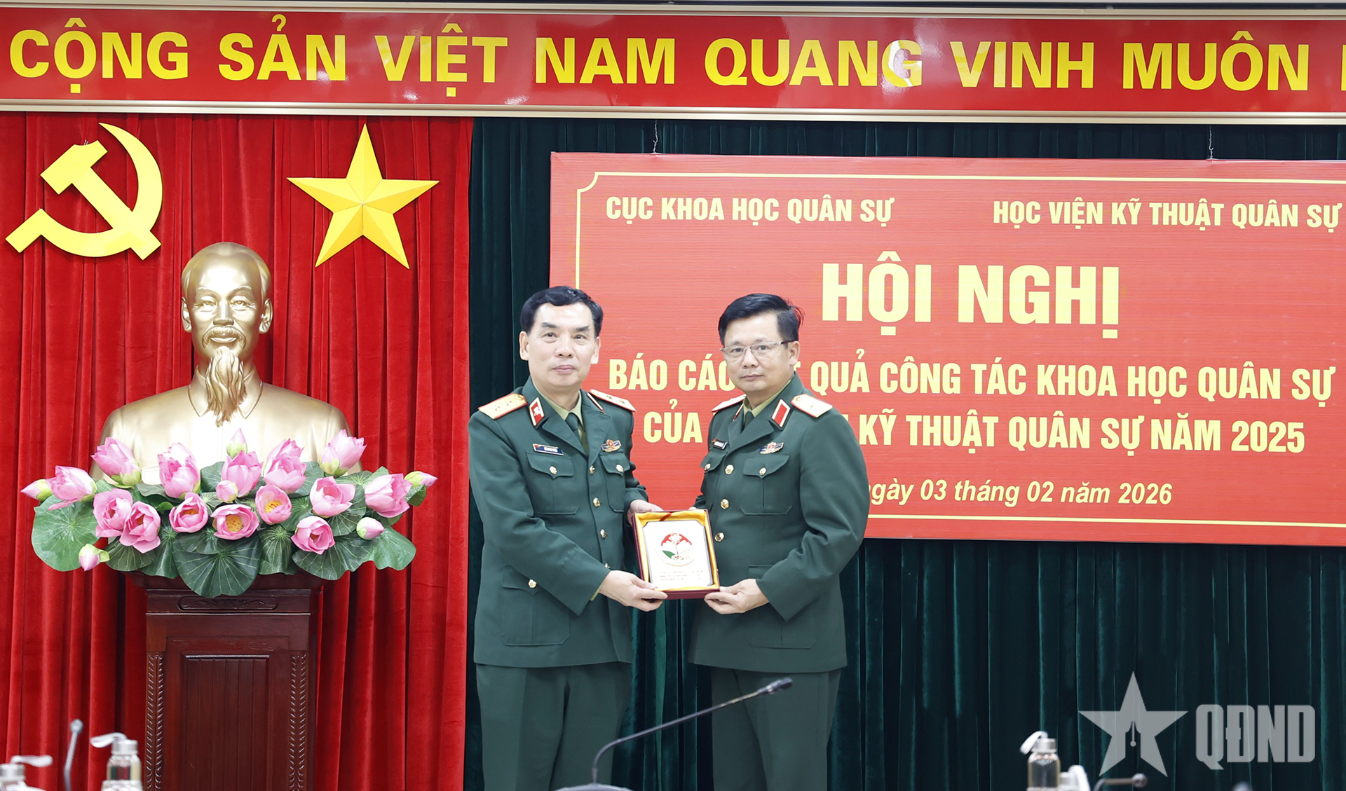 Lãnh đạo Cục Khoa học Quân sự trao quà lưu niệm tặng Học viện Kỹ thuật Quân sự.