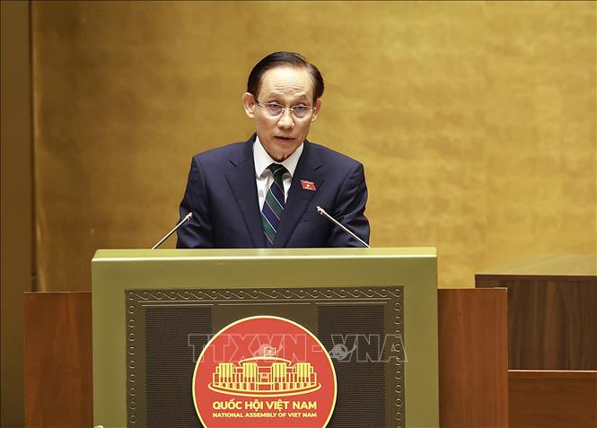 Chủ nhiệm Ủy ban Văn hóa và Xã hội của Quốc hội Nguyễn Đắc Vinh trình bày Báo cáo thẩm tra về 02 dự án: Luật sửa đổi, bổ sung một số điều của Luật Thi đua, khen thưởng; Luật Tín ngưỡng, tôn giáo (sửa đổi). Ảnh: Dương Giang/TTXVN