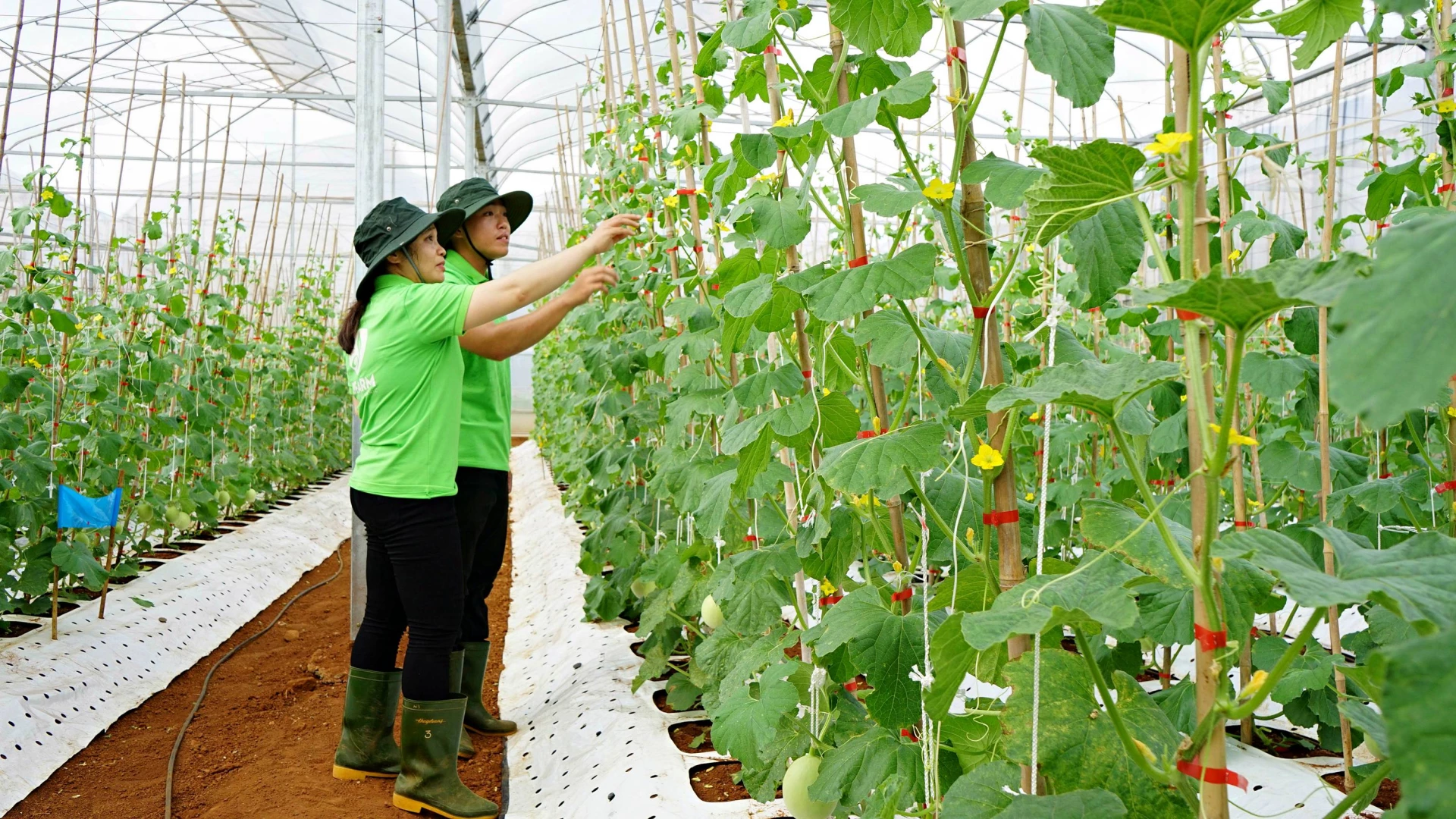 Chăm sóc dưa lê bạch ngọc trong nhà màng tại nông trại Dfarm Quảng Trị - Ảnh: L.A