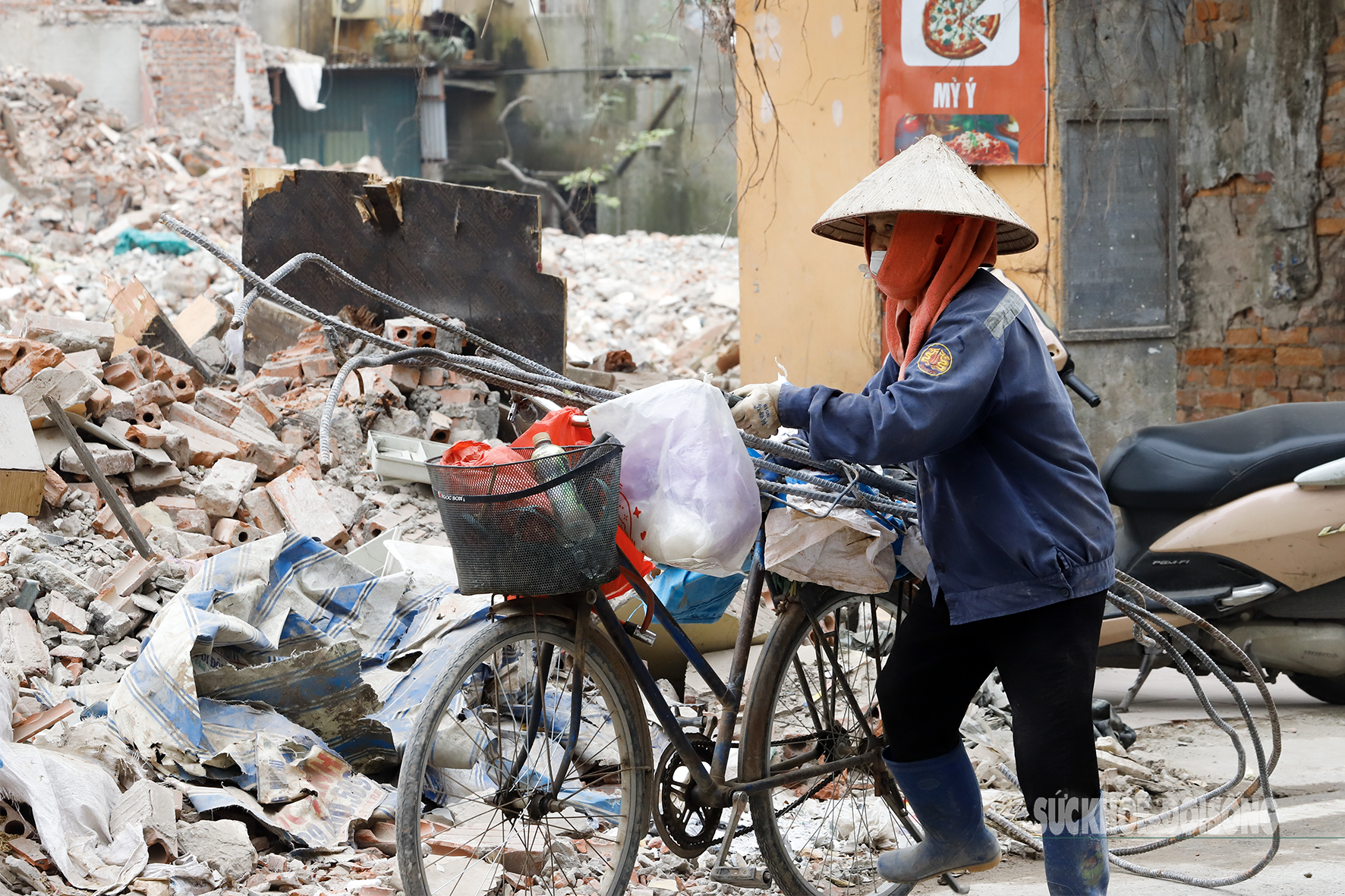 Người dân di chuyển qua khu vực giải tỏa, phía sau là nền đất trống và máy móc thi công – hình ảnh chuyển tiếp giữa sinh hoạt đô thị cũ và công trình hạ tầng mới.