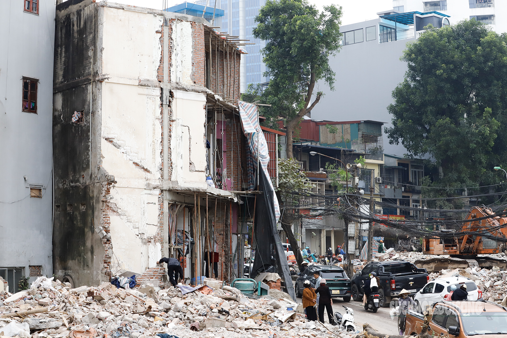 Những dãy nhà cũ kỹ bị "xẻ thân", lộ rõ kết cấu bên trong trước khi được tháo dỡ hoàn toàn, đánh dấu giai đoạn cuối của công tác giải phóng mặt bằng.