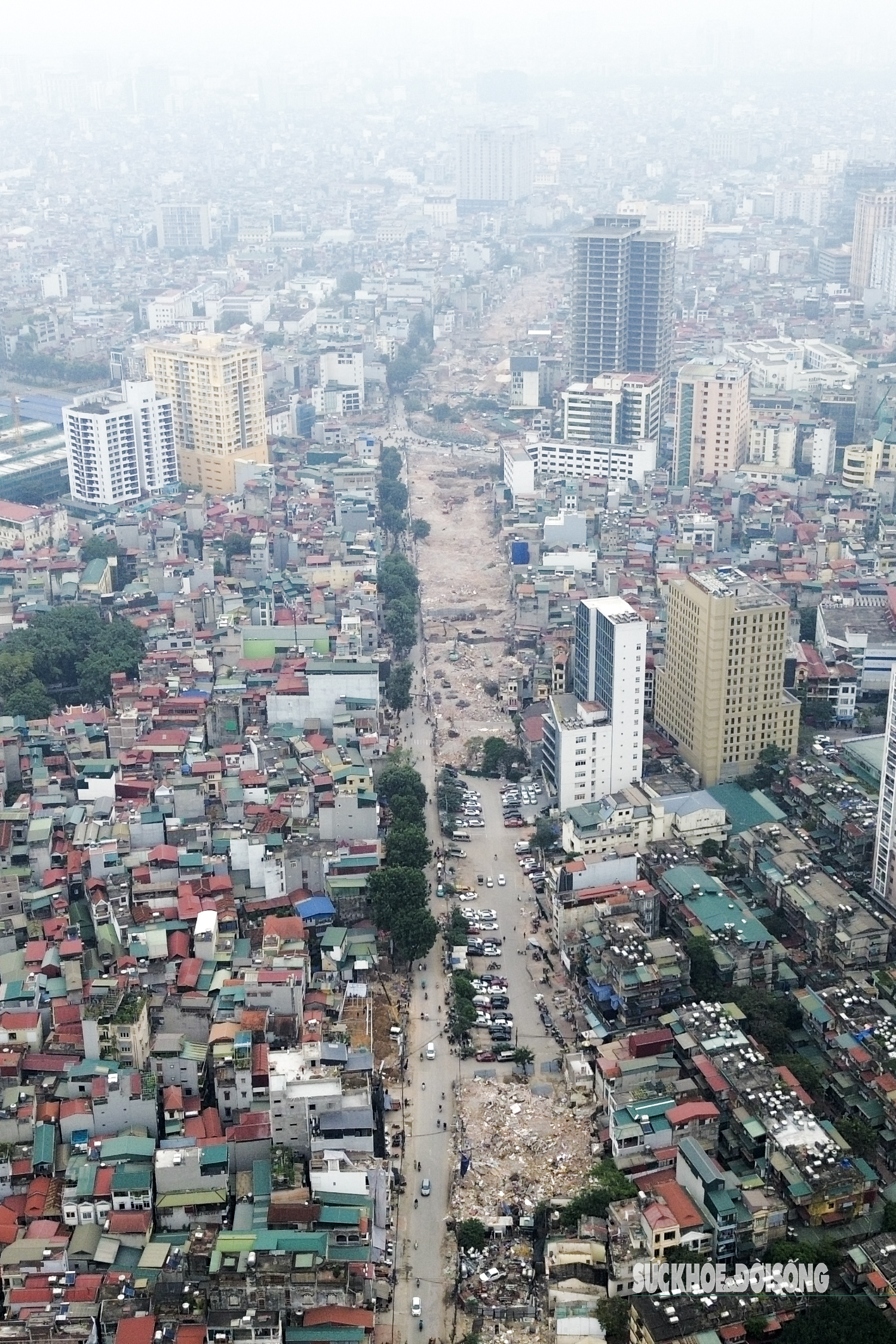 Toàn cảnh từ trên cao tuyến Đê La Thành sau giải tỏa, mặt bằng trải dài xuyên qua khu dân cư đông đúc, mở ra không gian cho tuyến Vành đai 1 trong tương lai.