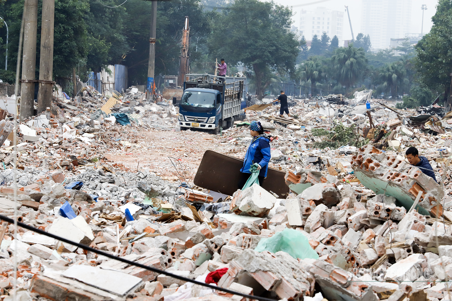 Hiện trường tháo dỡ với gạch đá, bê tông ngổn ngang; công nhân và xe chuyên dụng khẩn trương thu dọn, phân loại phế thải xây dựng.