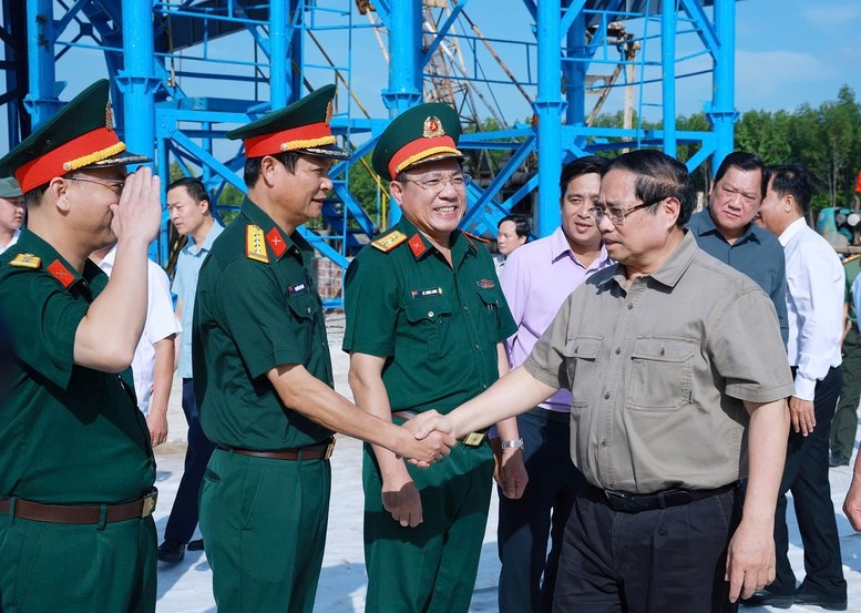 Thủ tướng Phạm Minh Chính thăm hỏi, động viên các lực lượng khi kiểm tra tiến độ thi công tuyến giao thông ra đảo Hòn Khoai và Cảng tổng hợp lưỡng dụng Hòn Khoai. Ảnh: TTXVN