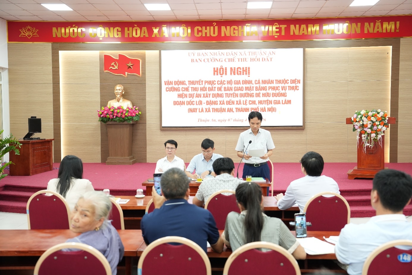 Ban cưỡng chế thu hồi đất xã Thuận An vừa tổ chức hội nghị vận động, thuyết phục các hộ gia đình, cá nhân thuộc diện cưỡng chế thu hồi đất để bàn giao mặt bằng phục vụ thực hiện dự án: Xây dựng tuyến đường đê Hữu Đuống đoạn qua dốc Lời - Đặng Xá đến xã Lệ Chi, huyện Gia Lâm (nay là xã Thuận An, thành phố Hà Nội).