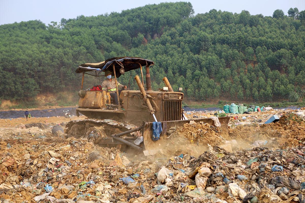 Mỗi ngày các công nhân môi trường đều phải sử dụng máy ủi để đẩy rác xuống hố.