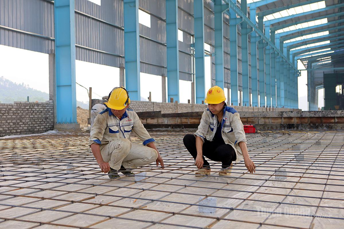 Công nhân đang hoàn thiện sắt để đổ nền móng.