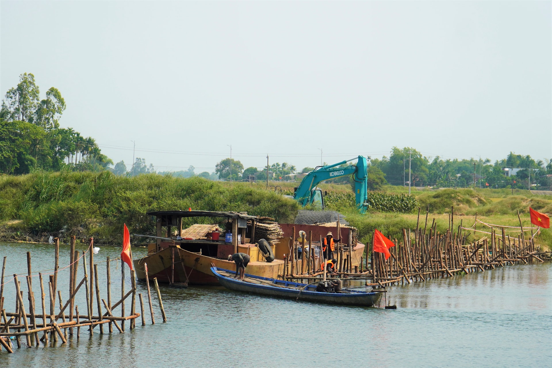 Đơn vị thi công hoàn thành đóng cọc cừ bạch đàn trên sông Vĩnh Điện trước khi sử dụng cát đắp đập. Ảnh: ĐĂNG NGUYÊN