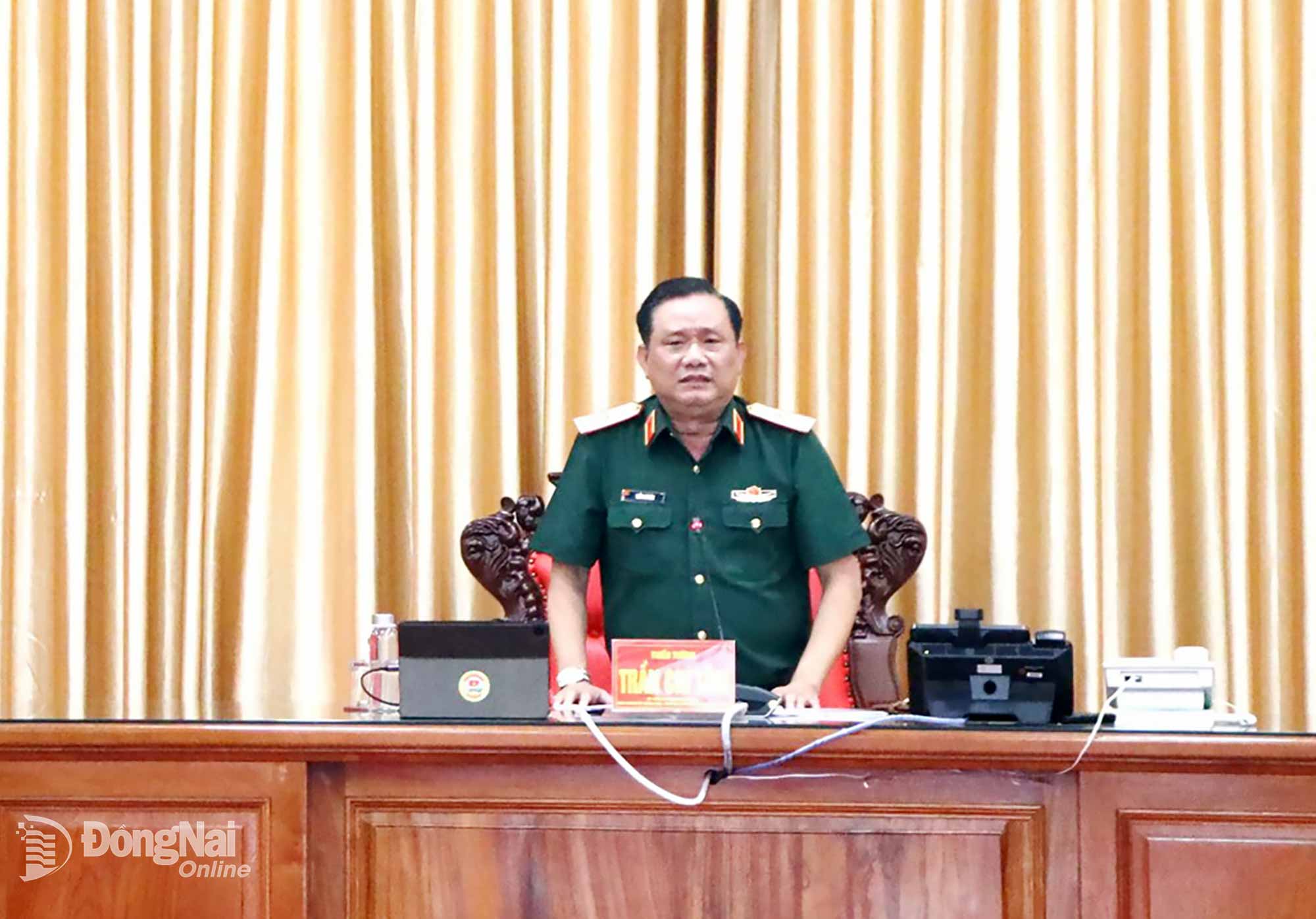 Thiếu tướng Trần Chí Tâm, Ủy viên Ban Thường vụ Đảng ủy Quân khu 7, Phó Chính ủy, Trưởng ban Chỉ đạo 515 Quân khu 7 chủ trì hội nghị. Ảnh: Nguyệt Hà