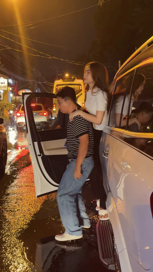 Nữ ca sĩ đi vội nên mang nhầm dép trong nhà, được cộng sự hỗ trợ băng qua đường. (Ảnh từ Tiktok Toby Phan)