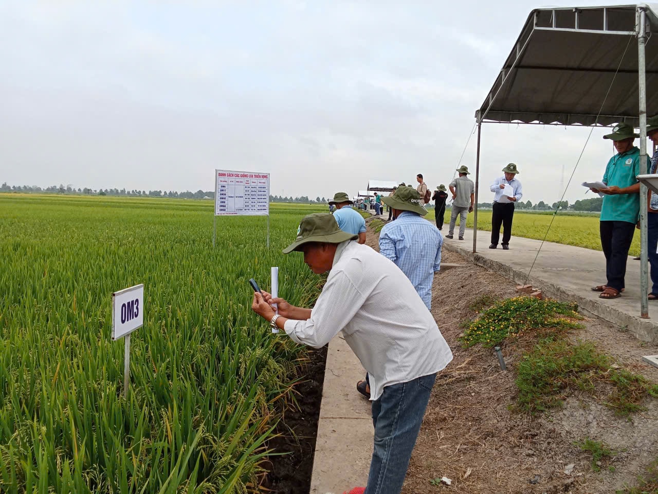 Ngay từ sáng sớm, các đại biểu và nông dân đã tham quan các mô hình ruộng lúa trình diễn với nhiều giống lúa mới do Viện Lúa ĐBSCL nghiên cứu và chọn tạo. Đây là những giống lúa có tiềm năng năng suất cao, hạt gạo dài, chất lượng tốt và phù hợp với nhu cầu thị trường trong nước lẫn xuất khẩu.