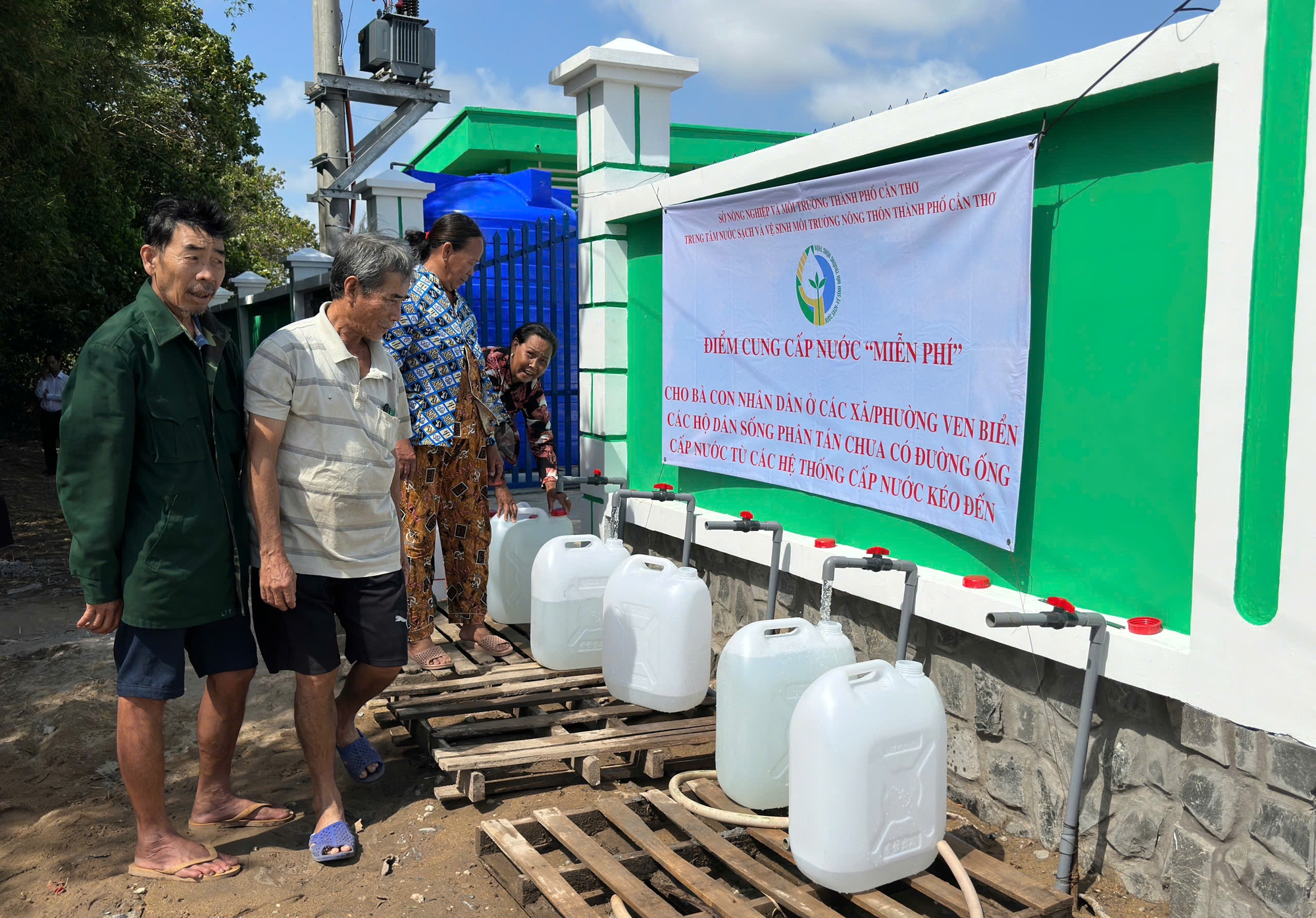 Người dân vùng ven biển TP Cần Thơ nhận nước miễn phí.