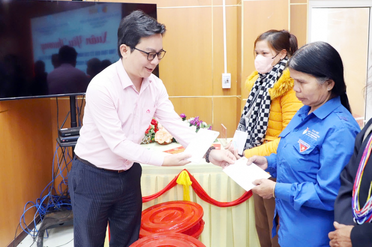 Phó Giám đốc, Phó Chủ tịch công đoàn cơ sở NHCSXH chi nhánh TP. Đà Nẵng, Nguyễn Dương Quang trao quà chương trình "Xuân yêu thương" cho bà còn xã vùng cao Phước Thành (Đà Nẵng)