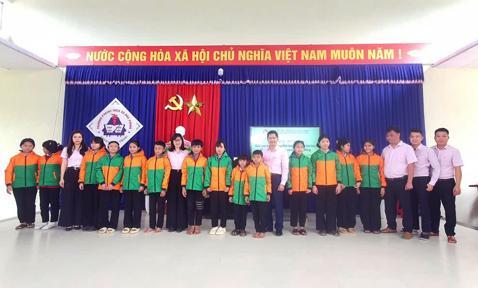 Các anh chị lãnh đạo NHCSXH chi nhánh TP. Đà Nẵng tận tay trao những chiếc áo ấm cho các em học sinh Trường Phổ thông Dân tộc Bán trú Tiểu học và Trung học Cơ sở xã Đắc Pring