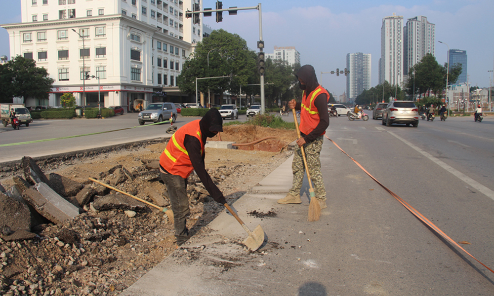 Công nhân dọn vệ sinh tại dự án cải tạo đường Lý Thái Tổ, phường Kinh Bắc.