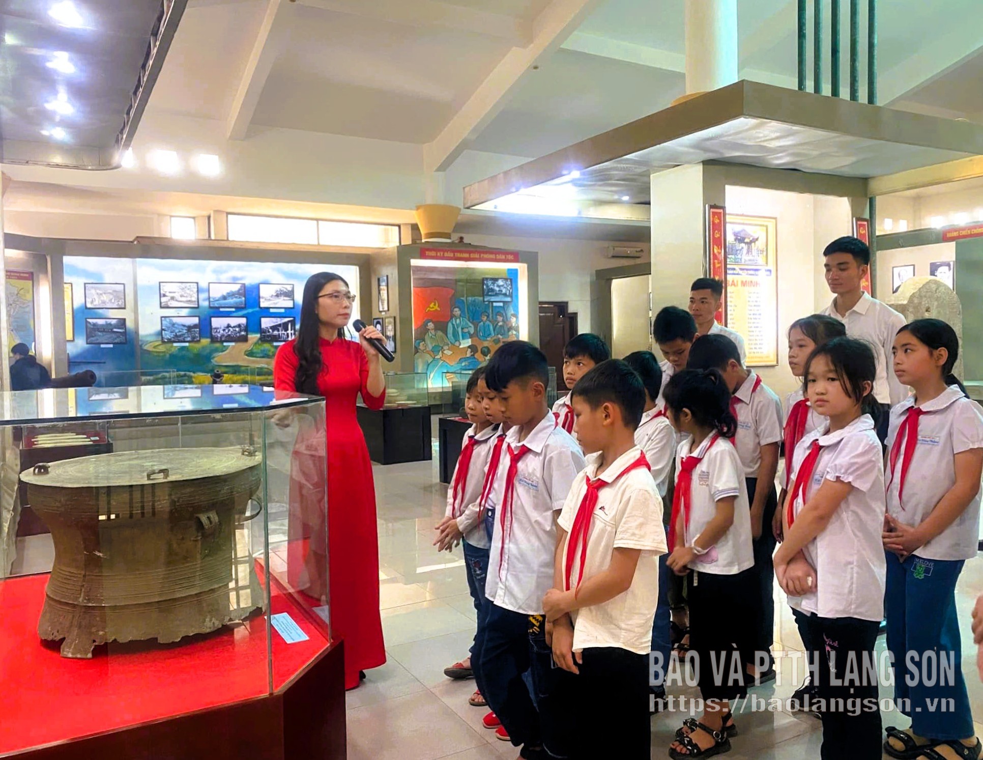 Thuyết minh viên Bảo tàng tỉnh giới thiệu cho các em học sinh trên địa bàn tỉnh về Trống đồng Na Dương tại nhà trưng bày