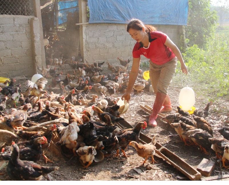 Chị Triệu Thị Điệp, dân tộc Nùng, ở xóm Vực Giảng, xã Tân Thành sau khi học nghề 3 tháng đã biết cách chọn con giống, nhận biết dịch bệnh và phòng trị bệnh cho gà, quy trình nuôi gà an toàn sinh học. Ảnh: Tuấn Minh