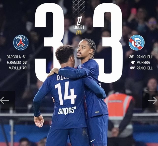 Bước sang hiệp 2, khi PSG chưa kịp ổn định đội hình, thì họ phải nhận thêm một bàn thua nữa, Panichelli hoàn tất cú đúp của mình để gia tăng cách biệt 3-1 cho Strasbourg vào phút thứ 49. Rất may cho PSG, vì chỉ sau đó 7 phút, họ được trọng tài cho hưởng penalty. Trên chấm 11m, Goncalo Ramos sút chính xác để rút ngắn tỉ số còn 2-3. Đến phút 79, Mayulu đánh đầu gỡ hòa 3-3 cho “gã nhà giàu” nước Pháp. 3-3 cũng là tỉ số cuối cùng của trận đấu.