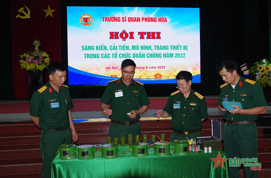Ban giám khảo nghe thí sinh thuyết trình bảo vệ sáng kiến tại Hội thi sáng kiến, cải tiến, mô hình trang thiết bị trong các tổ chức quần chúng Trường Sĩ quan Phòng hóa (Binh chủng Hóa học).