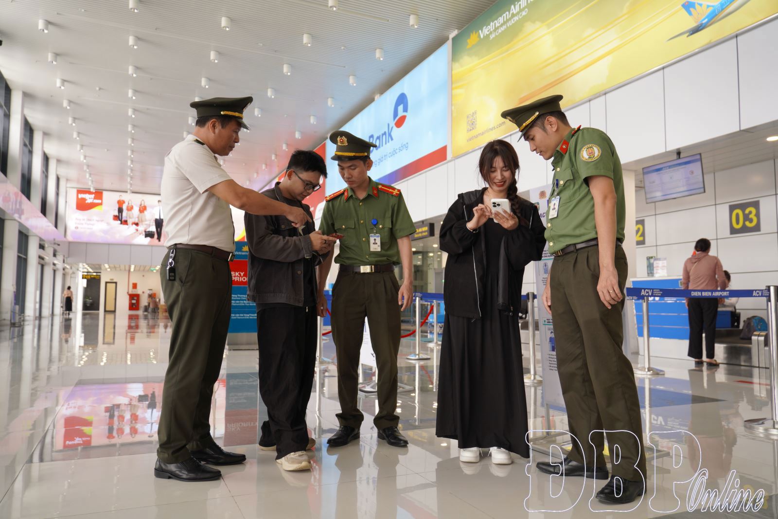 Lực lượng Công an, an ninh hàng không hướng dẫn hành khách sử dụng VNeID để mua vé online.