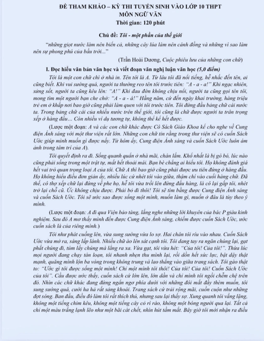 Đề tham khảo môn Ngữ văn kỳ thi vào lớp 10 trung học phổ thông. Nguồn Sở Giáo dục và Đào tạo Thành phố Hồ Chí Minh.
