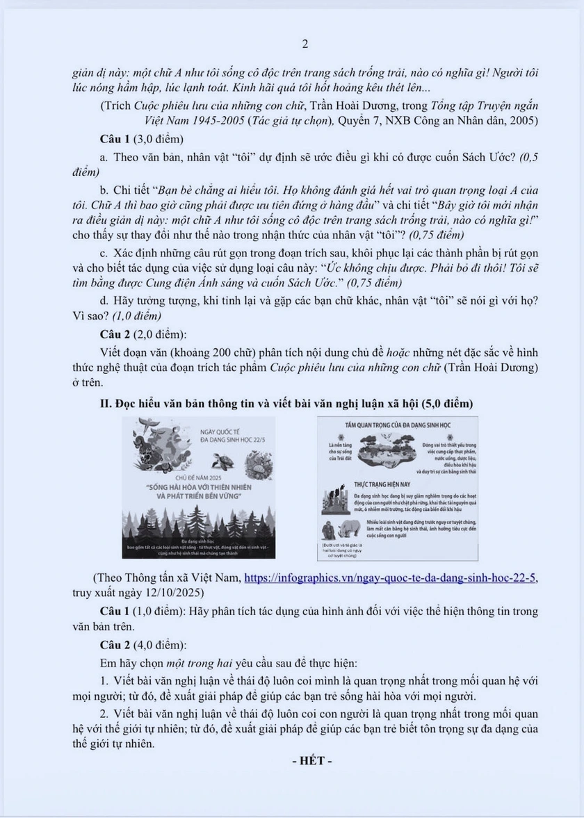 Cấu trúc đề rõ ràng, gồm hai phần (mỗi phần 5 điểm) gắn kết giữa đọc và viết. Phần 1 - Đọc hiểu văn bản văn học (3 điểm) và viết đoạn văn (2 điểm). Phần 2 - Đọc hiểu văn bản nghị luận hoặc thông tin (1 điểm) và viết bài văn nghị luận xã hội (4 điểm).