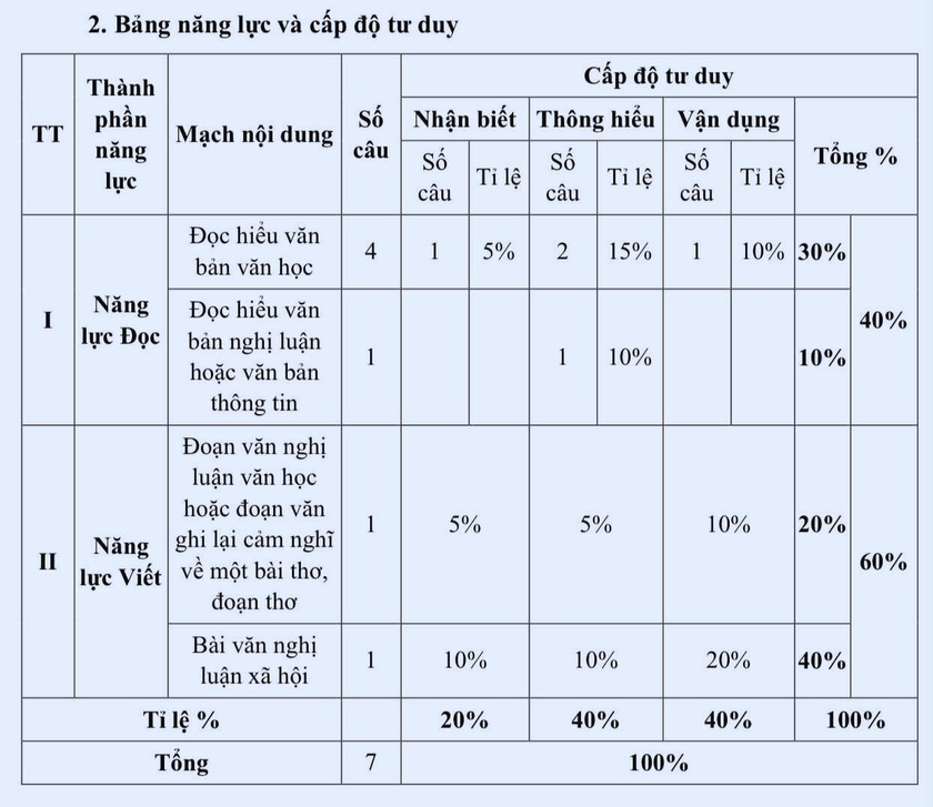 Yêu cầu năng lực và cấp độ tư duy trong đề môn Ngữ văn thi lớp 10 Thành phố Hồ Chí Minh. Nguồn Sở Giáo dục và Đào tạo Thành phố Hồ Chí Minh.
