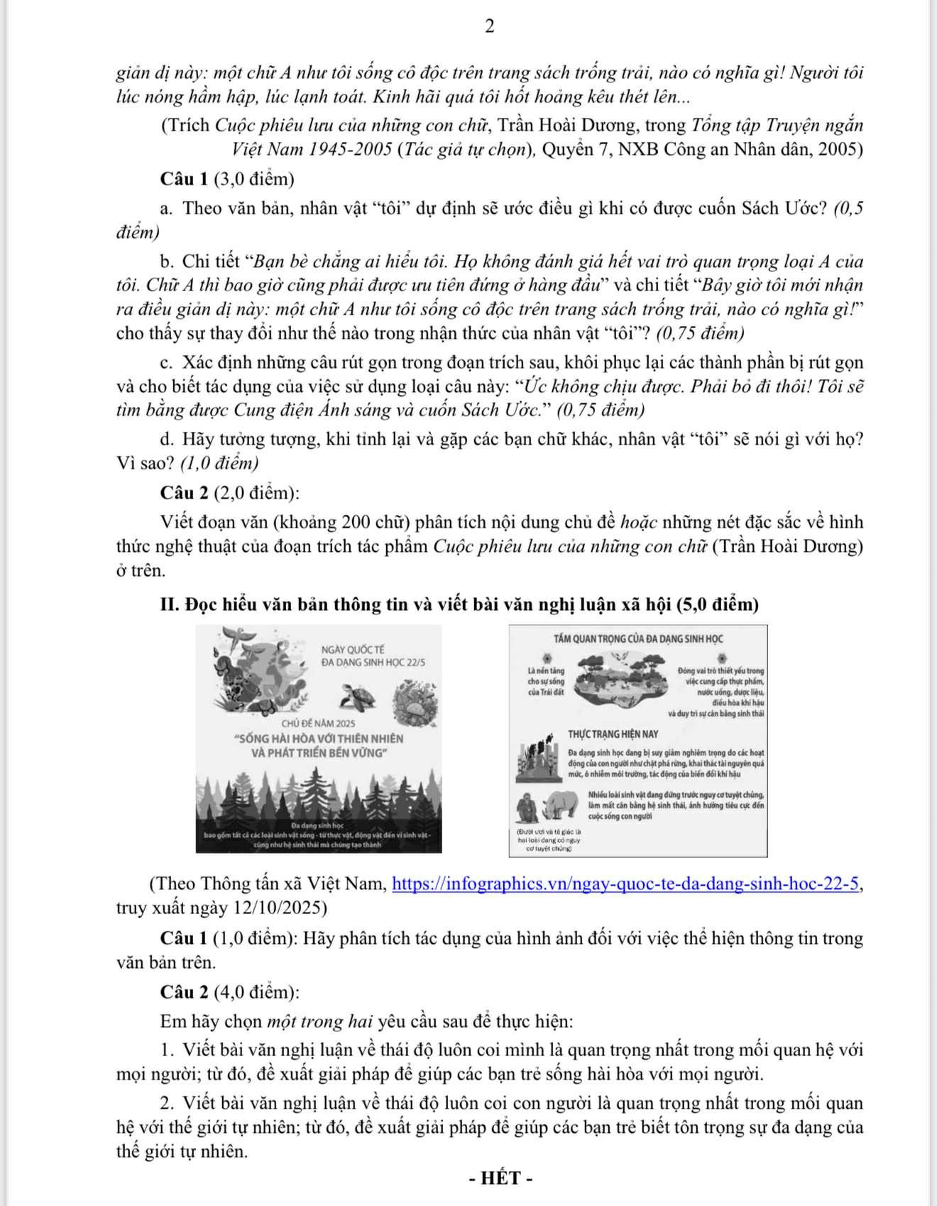 Cấu trúc đề rõ ràng, gồm hai phần (mỗi phần 5 điểm) gắn kết giữa đọc và viết. Phần 1 - Đọc hiểu văn bản văn học (3 điểm) và viết đoạn văn (2 điểm). Phần 2 - Đọc hiểu văn bản nghị luận hoặc thông tin (1 điểm) và viết bài văn nghị luận xã hội (4 điểm).