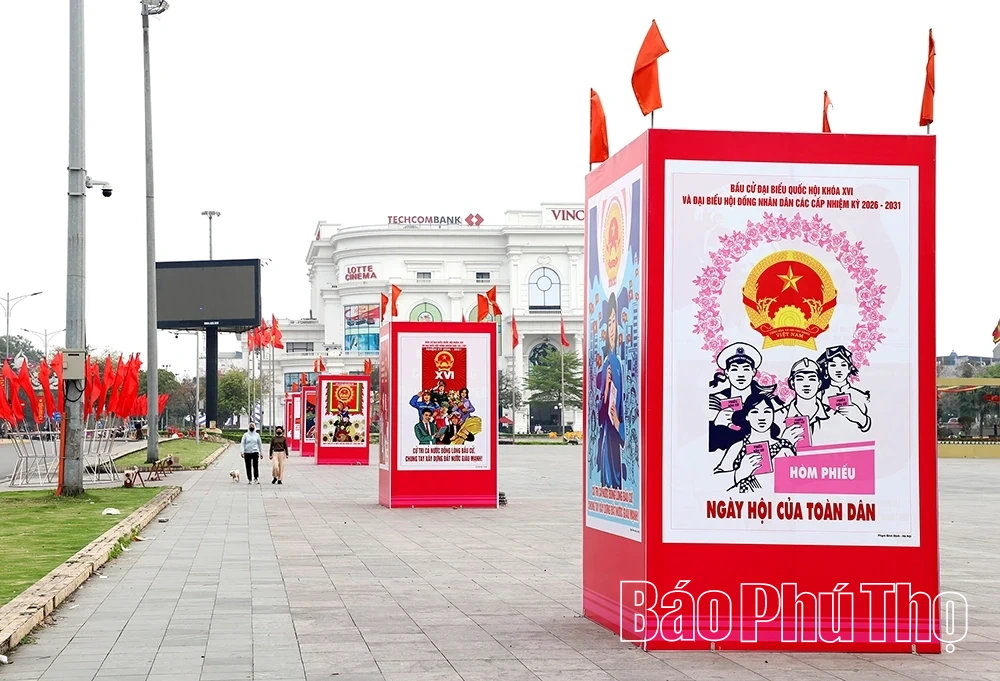 Nhiều tấm pa-nô chào mừng cuộc bầu cử đại biểu Quốc hội khóa XVI và đại biểu HĐND các cấp nhiệm kỳ 2026-2031 được đặt tại các tuyến phố trên địa bàn phường Việt Trì.