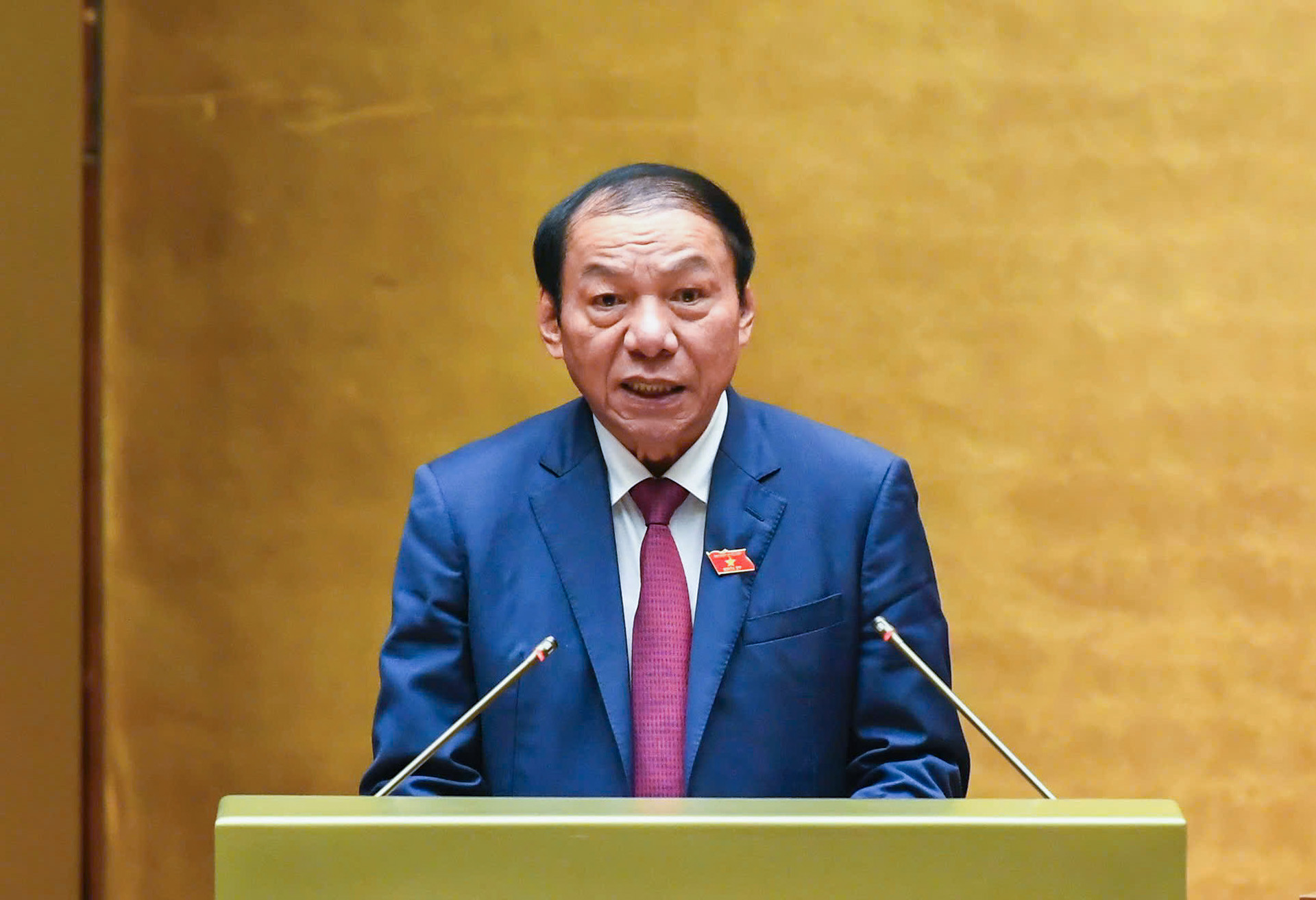 Bộ trưởng Văn hóa, Thể thao và Du lịch Nguyễn Văn Hùng trình bày tờ trình. Ảnh: Quốc hội