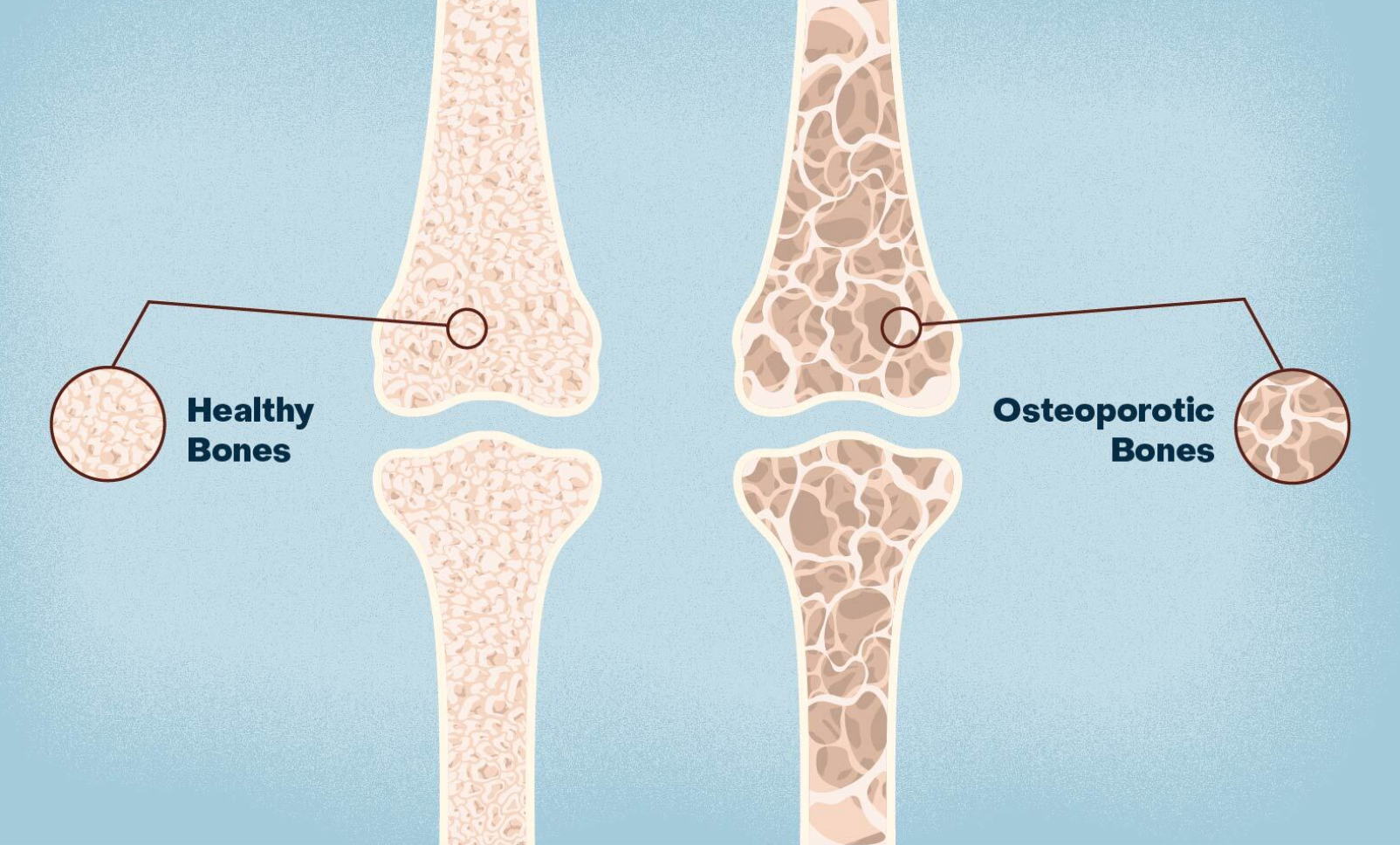 So sánh giữa xương khỏe mạnh và loãng xương. Loãng xương là tình trạng mất mật độ khoáng chất trong xương, khiến xương trở nên giòn, dễ gãy và khó hồi phục, làm giảm đáng kể khả năng vận động và chất lượng sống.