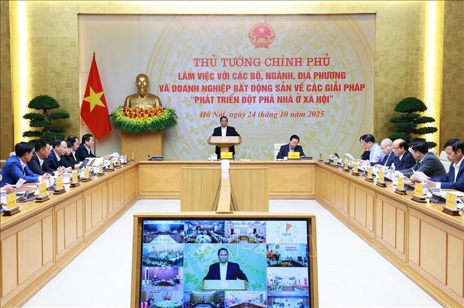 Thủ tướng Phạm Minh Chính làm việc về các giải pháp “phát triển đột phá nhà ở xã hội”, ngày 24/10/2025. Ảnh: Dương Giang/TTXVN