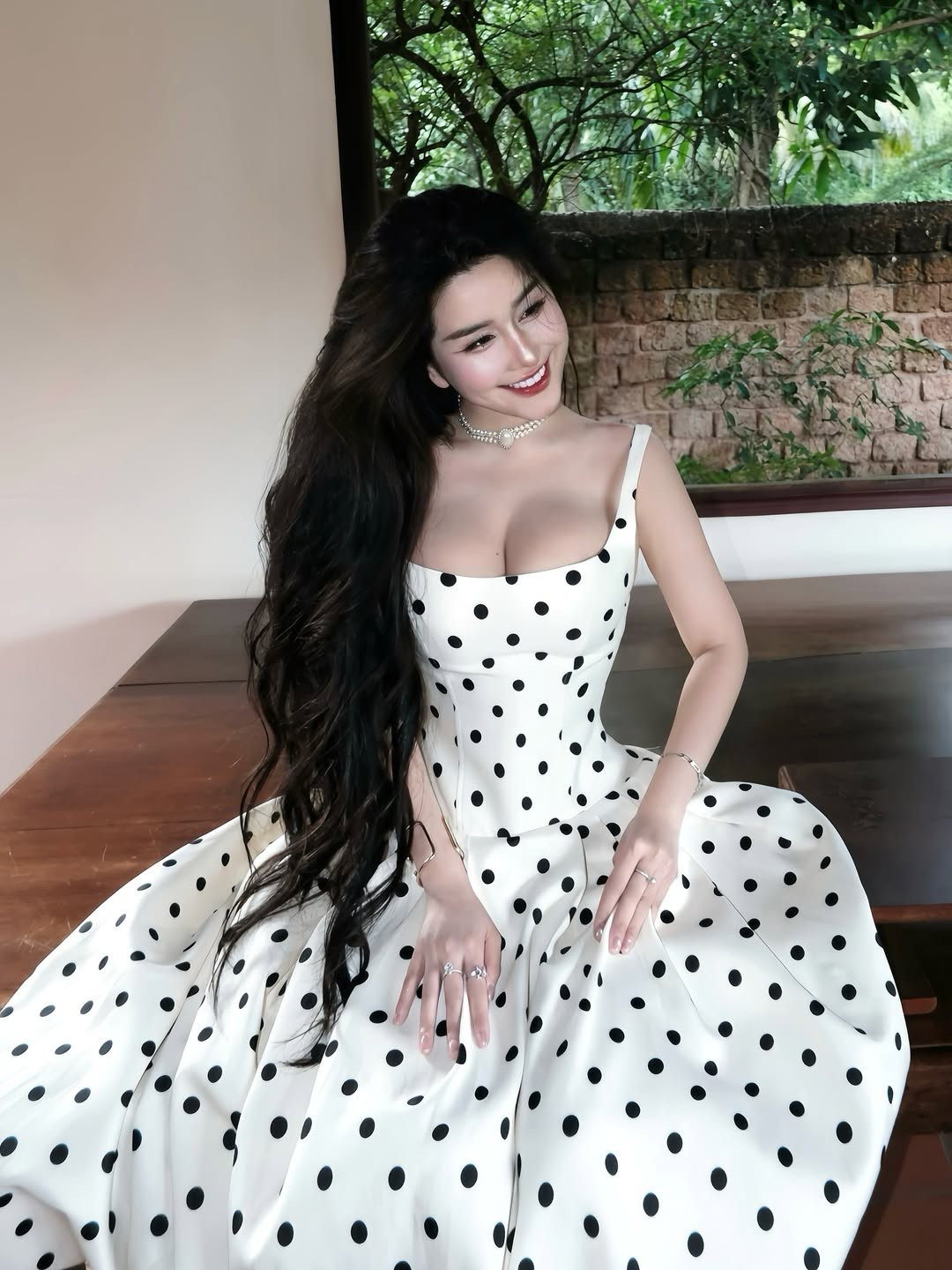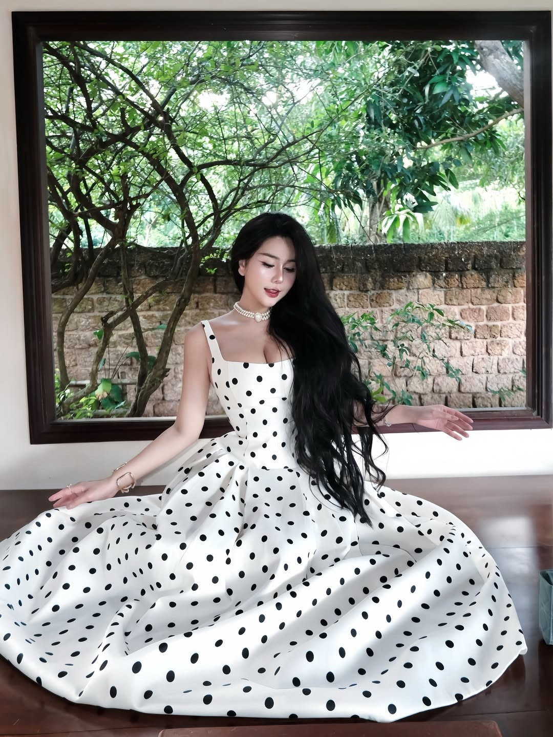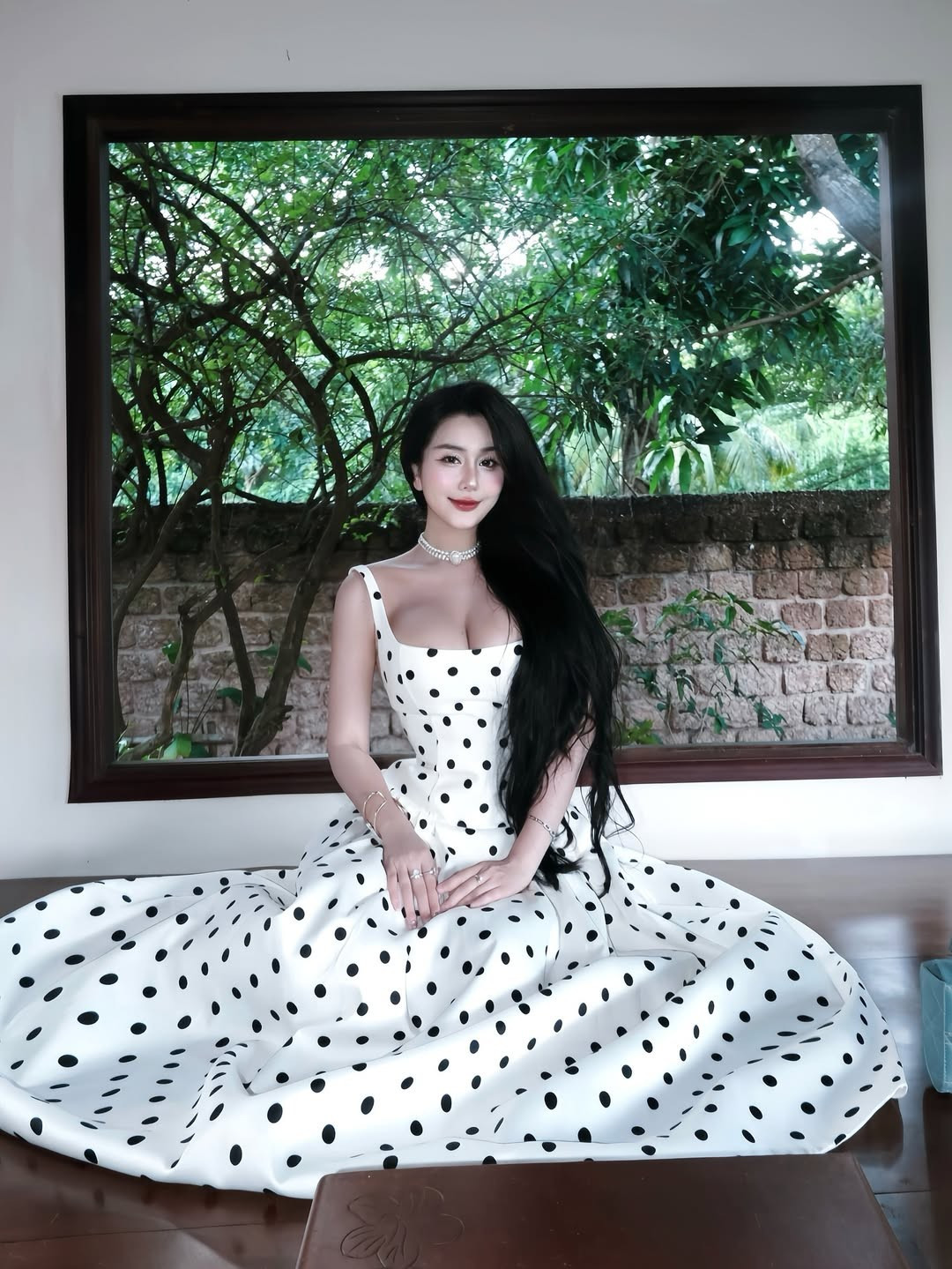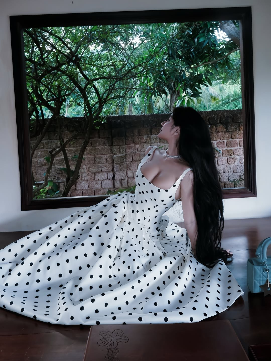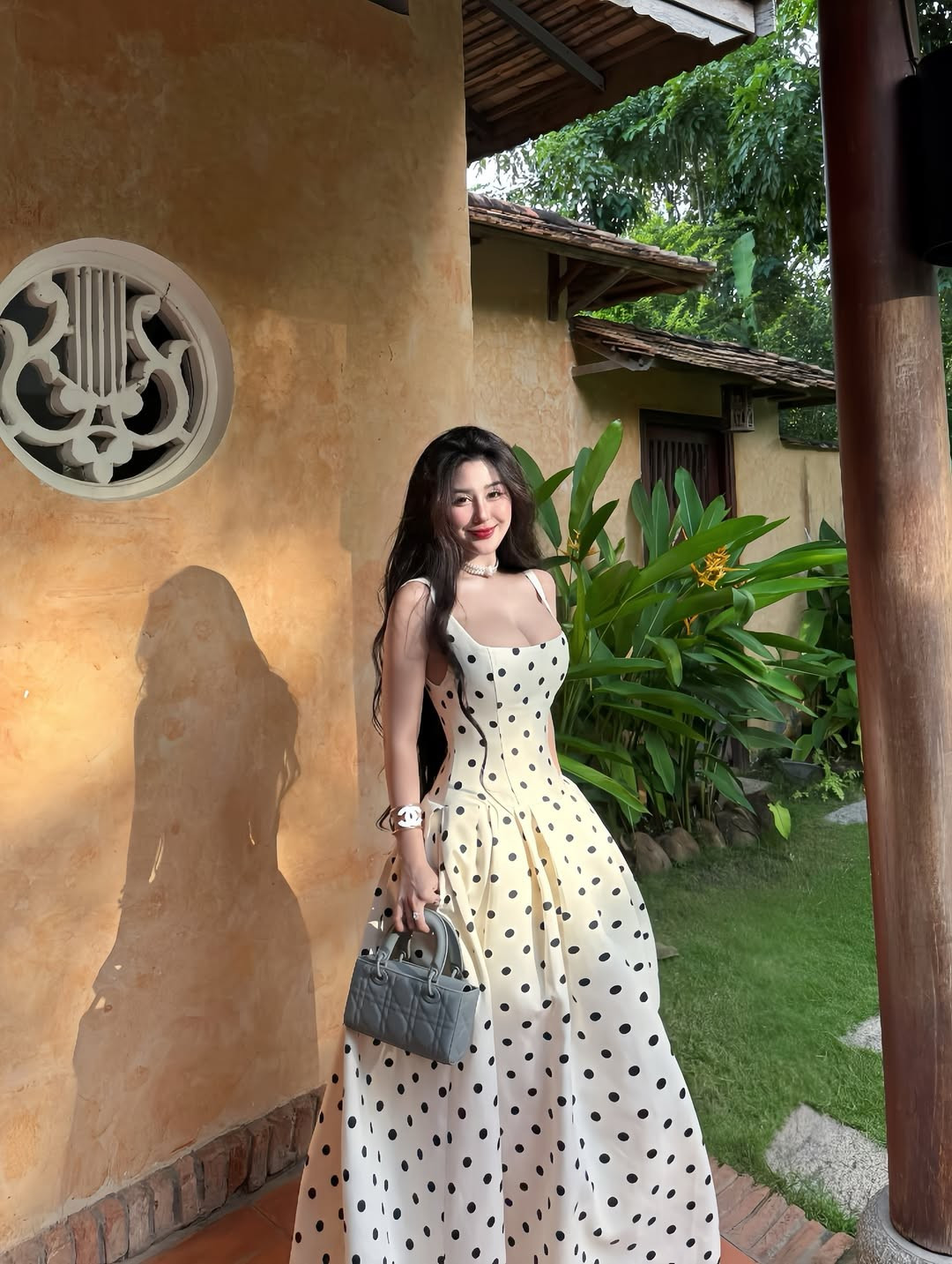 Trong loạt ảnh mới được chia sẻ trên trang cá nhân, Võ Ngọc Trân chọn diện chiếc váy maxi hai dây với họa tiết chấm bi đen trên nền vải trắng. (Ảnh: IGNV)