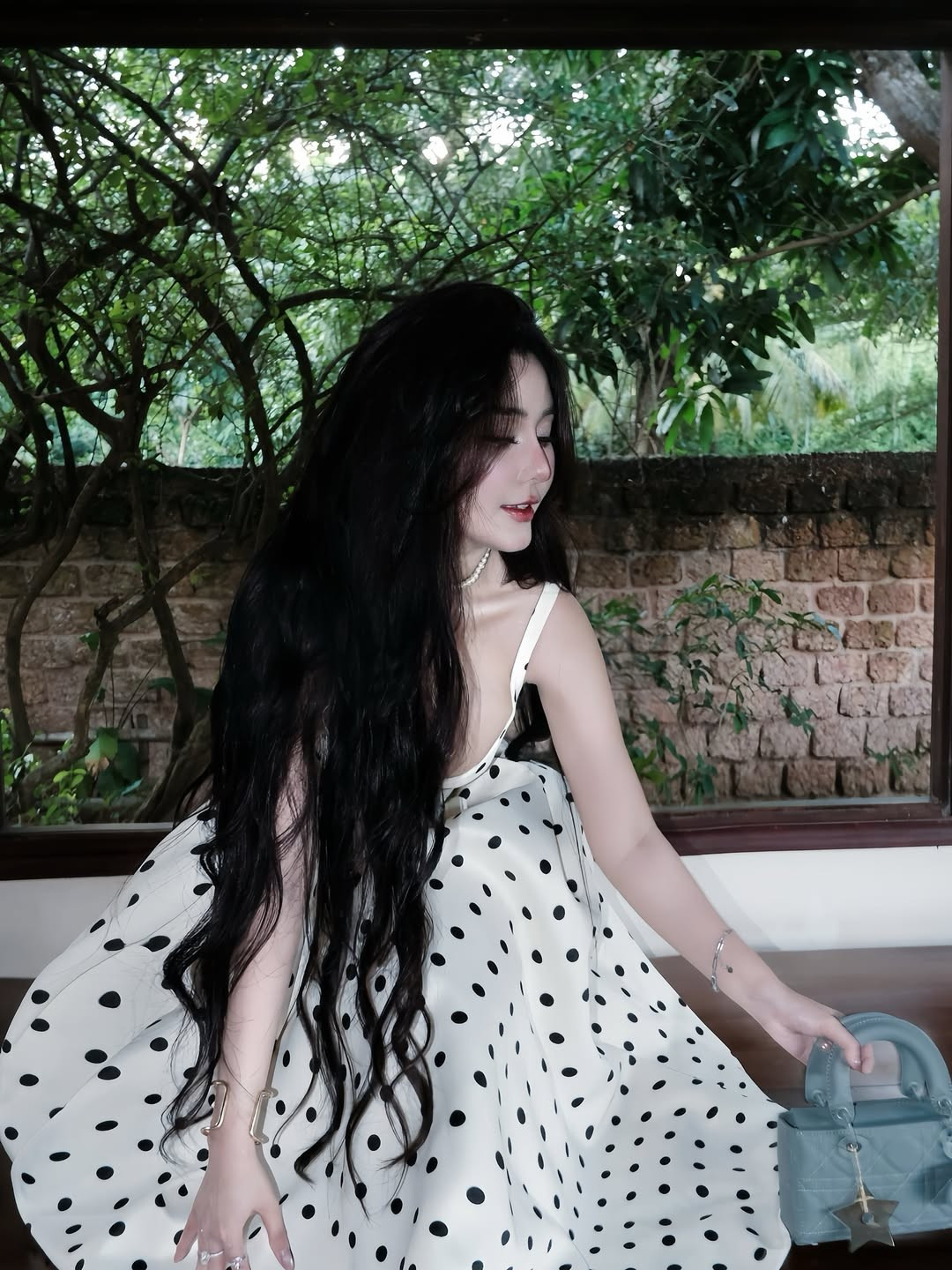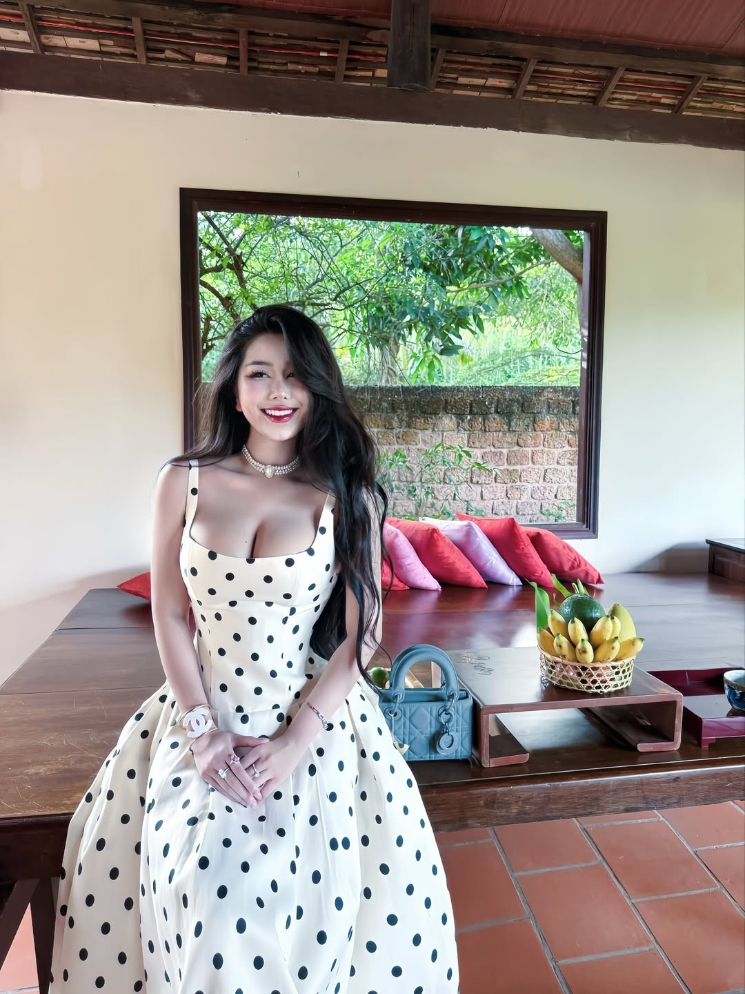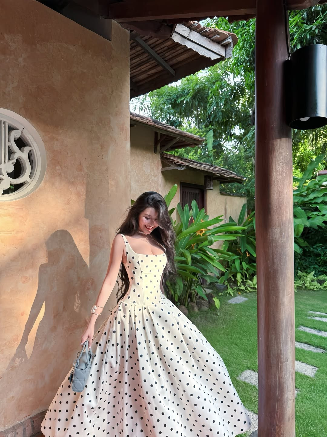 Đặc biệt, là một trong những họa tiết không bao giờ lỗi mốt, chấm bi mang lại sự trẻ trung, nổi bật và có chút hoài cổ, rất hợp với không gian kiến trúc truyền thống, nhiều cây xanh mà cô nàng lựa chọn. (Ảnh: IGNV)