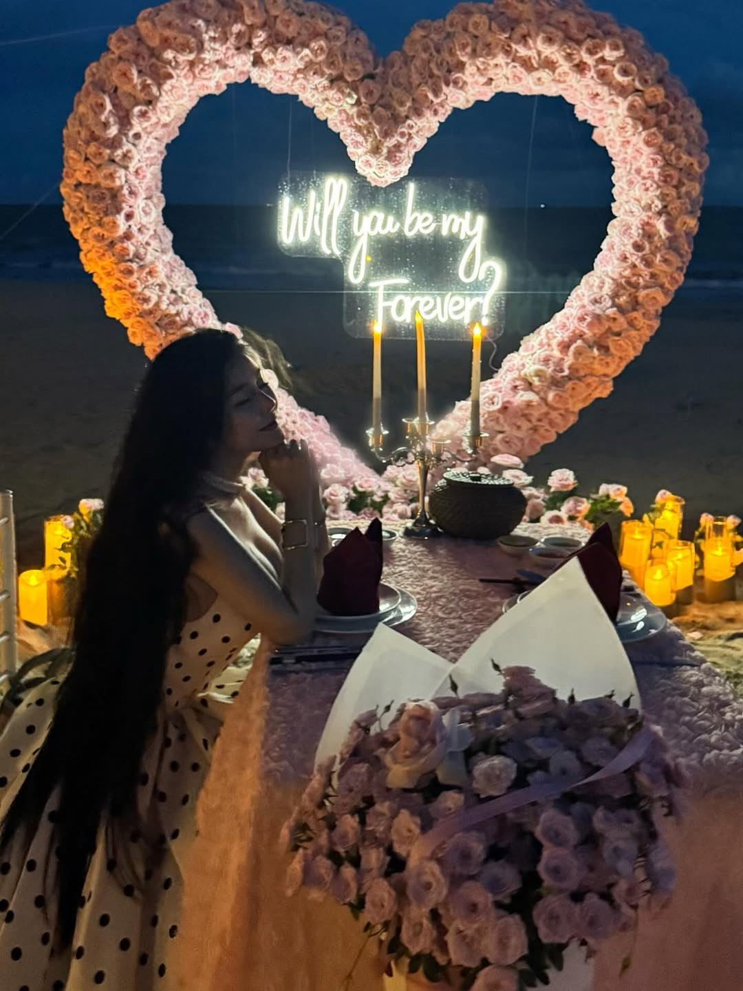 Không gian được trang hoàng bằng hàng nghìn đóa hồng pastel kết thành hình trái tim khổng lồ, cùng ánh nến lung linh và dòng chữ neon lãng mạn "Will you be my Forever?". (Ảnh: IGNV)