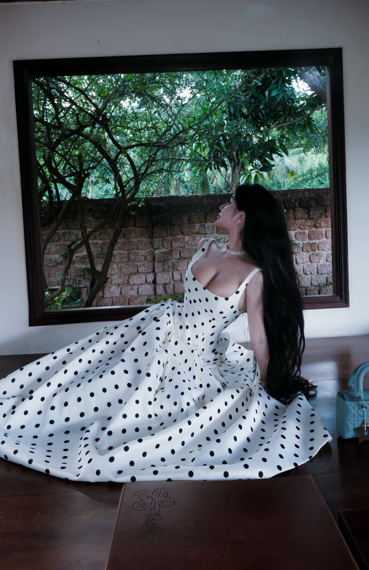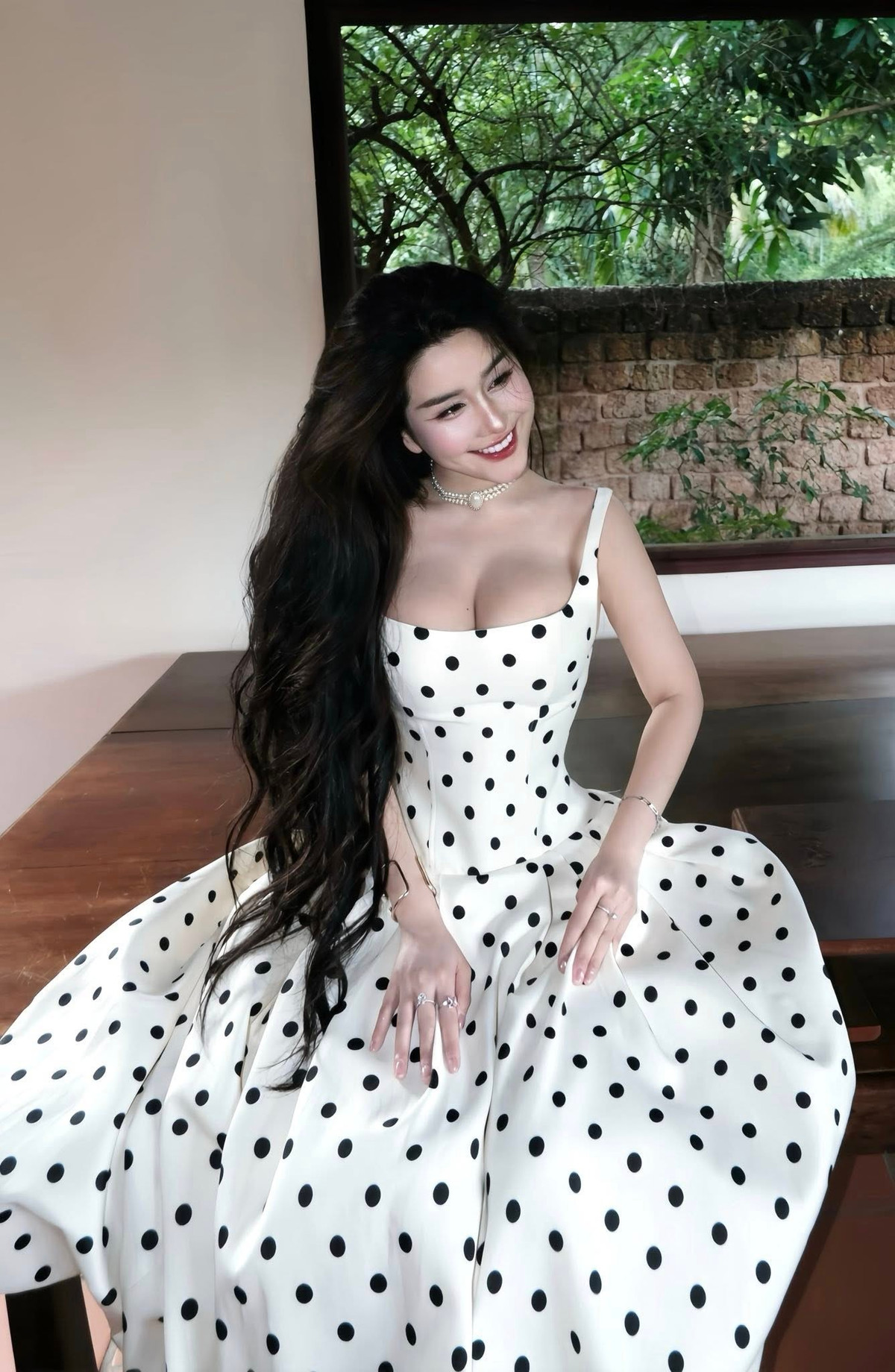 Không chỉ xinh đẹp, Ngọc Trân còn ghi điểm bởi gu thời trang tinh tế. Váy chấm bi cổ điển kết hợp phụ kiện tối giản như vòng cổ mảnh, nhẫn bạc và hoa tai nhỏ xinh giúp cô giữ được sự thanh lịch, không phô trương nhưng vẫn đầy cuốn hút.