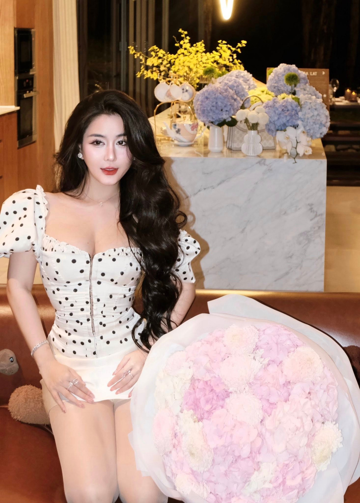 Trong không gian phòng khách sang trọng, điểm xuyết những bó hoa pastel và ánh đèn vàng ấm, Võ Ngọc Trân nổi bật với vẻ đẹp rạng rỡ.