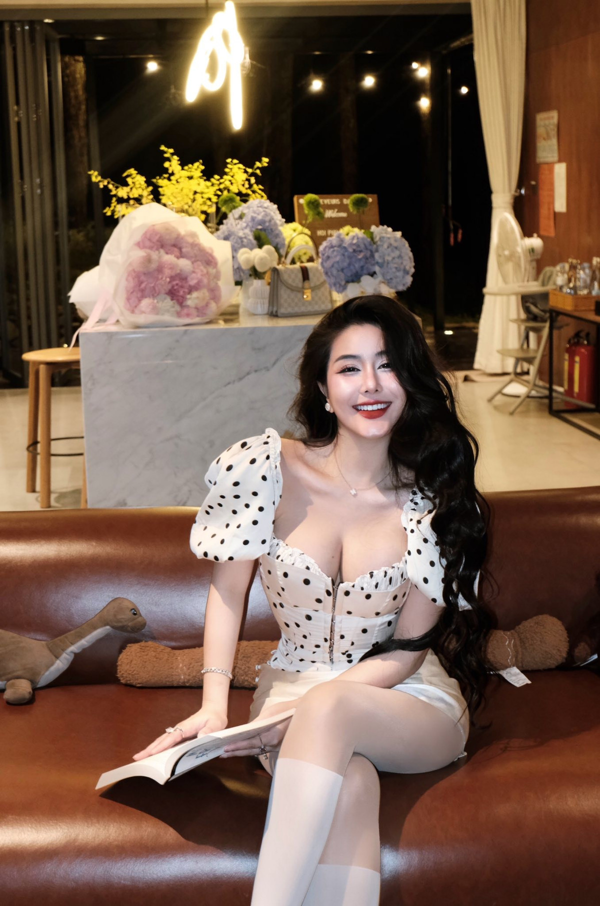 Chiếc corset chấm bi với phần cổ vuông gợi cảm giúp tôn vòng một gợi cảm – đặc trưng làm nên thương hiệu của Ngọc Trân. Kết hợp cùng chân váy trắng và tất mỏng tôn đôi chân thon, nữ hot girl toát lên thần thái kiêu kỳ nhưng không kém phần nữ tính.