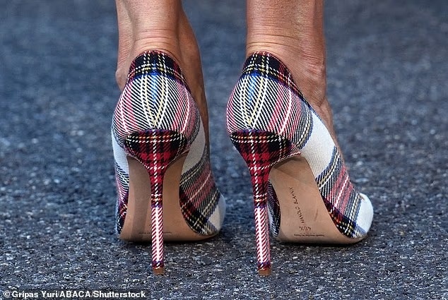 Bà đi đôi găng tay đỏ sẫm dài đến khuỷu tay và giày cao gót có họa tiết tartan Manolo Blahnik, gợi nhắc đến truyền thống Scotland - nơi mẹ Tổng thống Donald Trump sinh ra và lớn lên. Ảnh: Gripas Yuri/ ABACA/ Shutterstock.