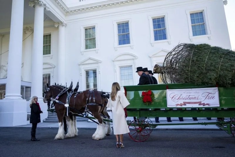 Cây thông cao 25 foot (khoảng 7,6 mét) thuộc giống concolor fir đã được đưa tới Nhà Trắng bằng cỗ xe ngựa hôm 24/11. Ảnh: Bonnie Cash/UPI.