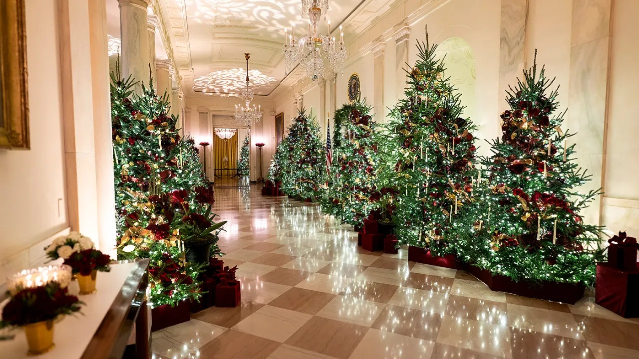Năm nay, 75 vòng hoa mang dấu ấn của bà Melania cùng những chiếc nơ đỏ cổ điển đã được treo trên các ô cửa sổ Nhà Trắng. Bên cạnh đó là 50 cây thông, 213m dây hoa, 7.600m ruy băng và 10.000 cánh bướm đã được sử dụng để trang trí các hành lang.